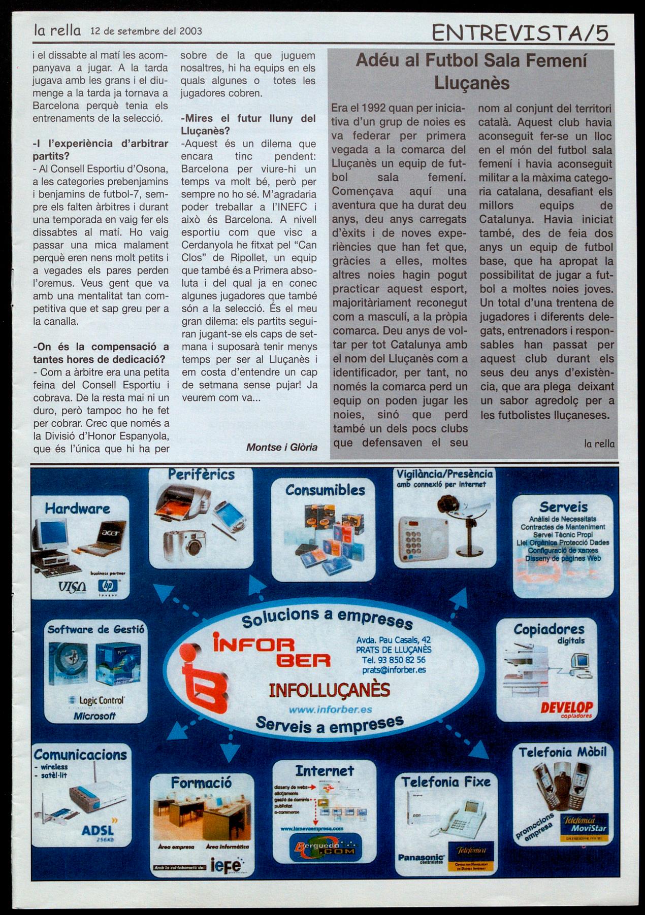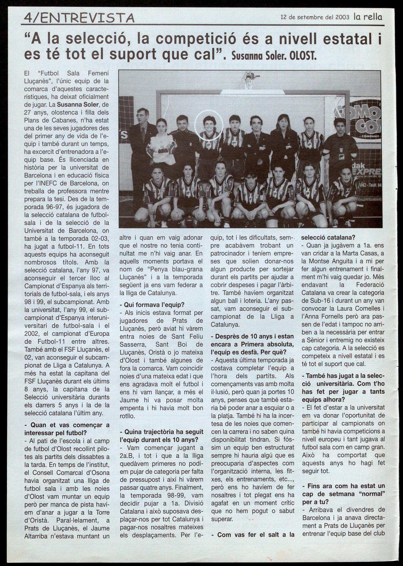 El "Futbol Sala Femení Lluçanès", l'únic equip de la comarca d'aquestes característiques, ha deixat oficialment de jugar. La Susanna Soler, de 27 anys, olostenca filla dels Plans de Cabanes, n'ha estat una de les seves jugadores des del primer any de vida de l'equip també durant un temps, ha excercit d'entrenadora a l'equip base. És llicenciada en història per la universitat de Barcelona en educació física per I'INEFC de Barcelona, on treballa de professora mentre prepara la tesi. Des de la temporada 96-97, és jugadora de la selecció catalana de futbolsala i de la selecció de la Universitat de Barcelona, on també a la temporada 02-03, ha jugat a futbol-11. En tots aquests equips ha aconseguit nombrosos títols. Amb la selecció catalana, l'any 97, va aconseguir el tercer lloc al Campionat d'Espanya als territorials de futbol-sala, els anys 98 i 99, el subcampionat. Amb la universitat, l'any 99, el subcampionat d'Espanya interuniversitari de futbol-sala el 2002, el campionat d'Europa de Futbol-11 entre altres.