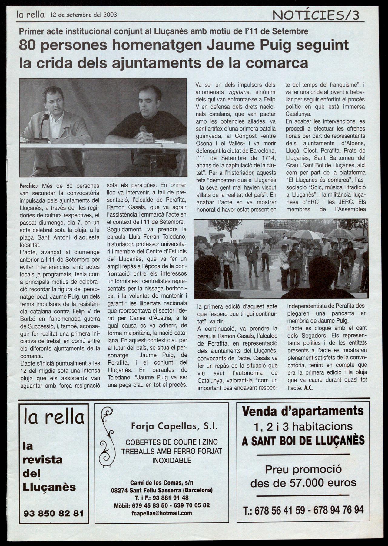 Independentista de Perafita desplegaren una pancarta en memòria de Jaume Puig. L'acte es clogué amb el cant dels Segadors. Els representants polítics de les entitats presents a l'acte es mostraren plenament satisfets de la convocatòria, tenint en compte que era la primera edició la pluja que va caure durant quasi tot l'acte. A.C.