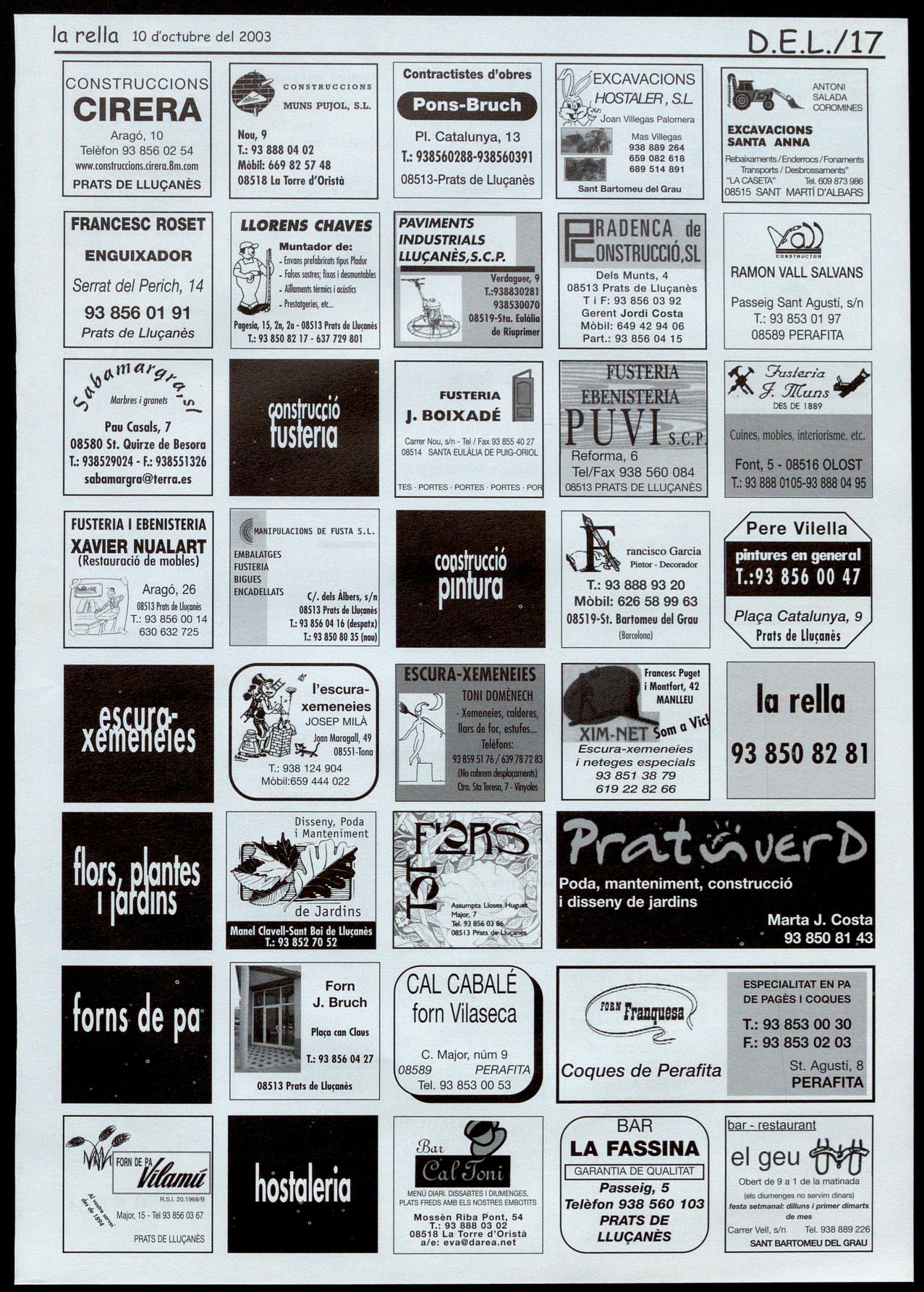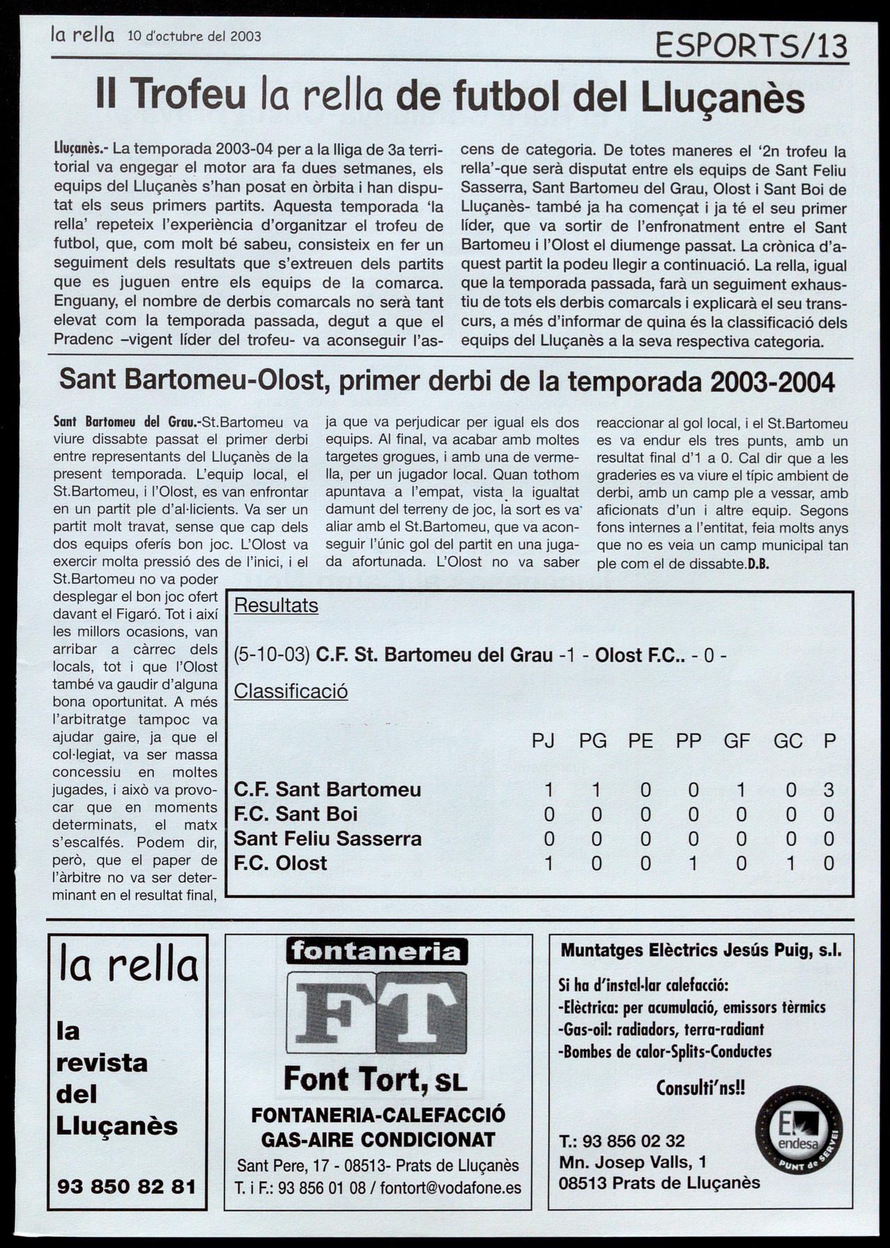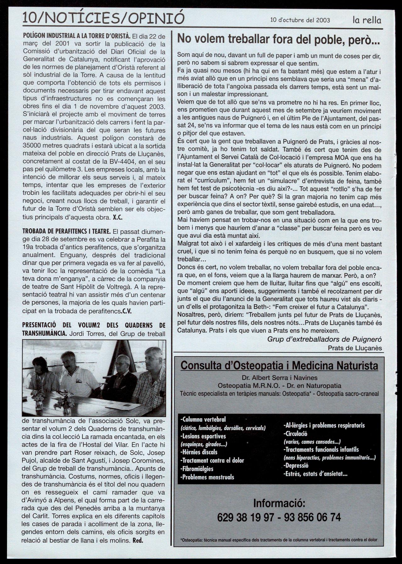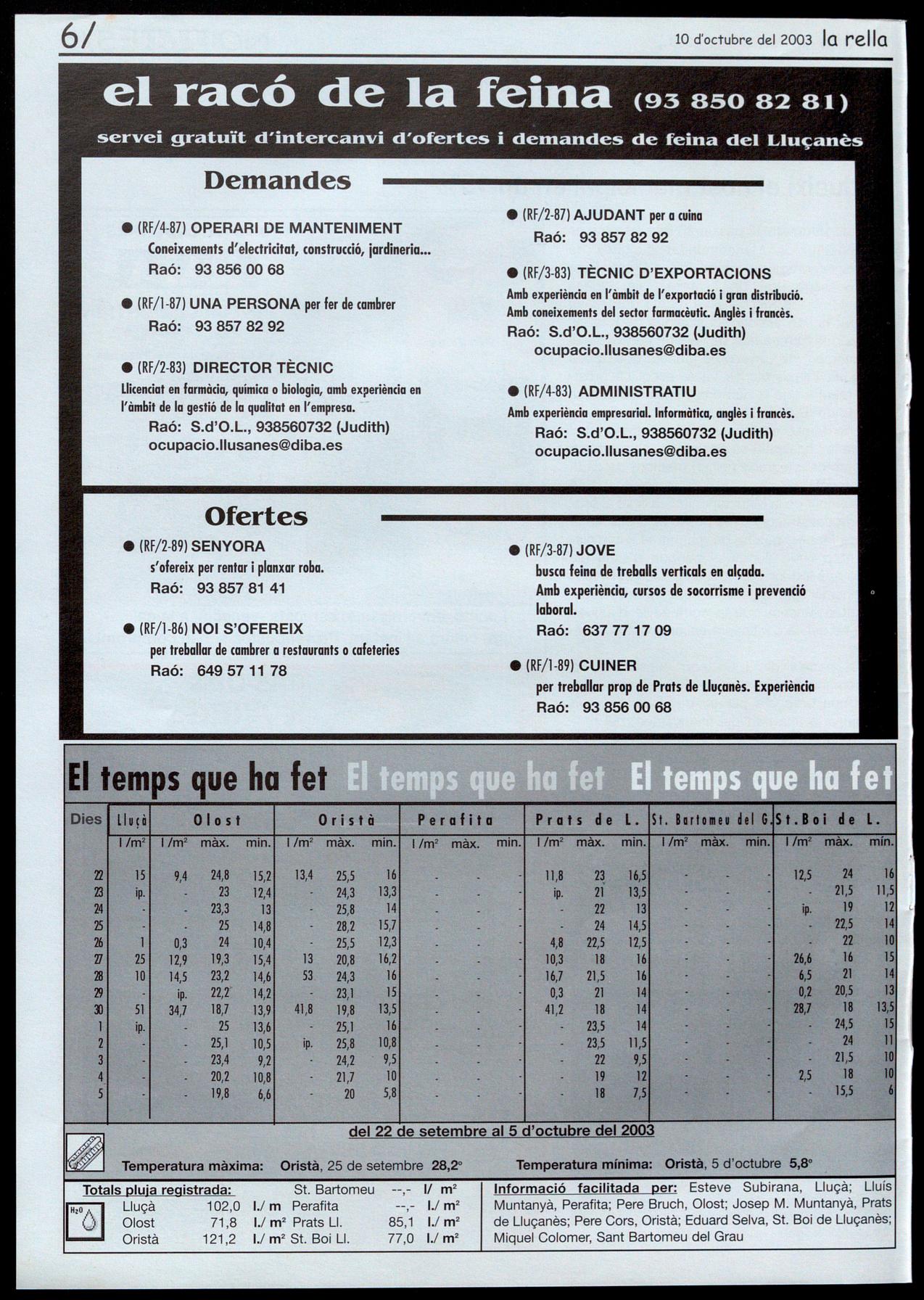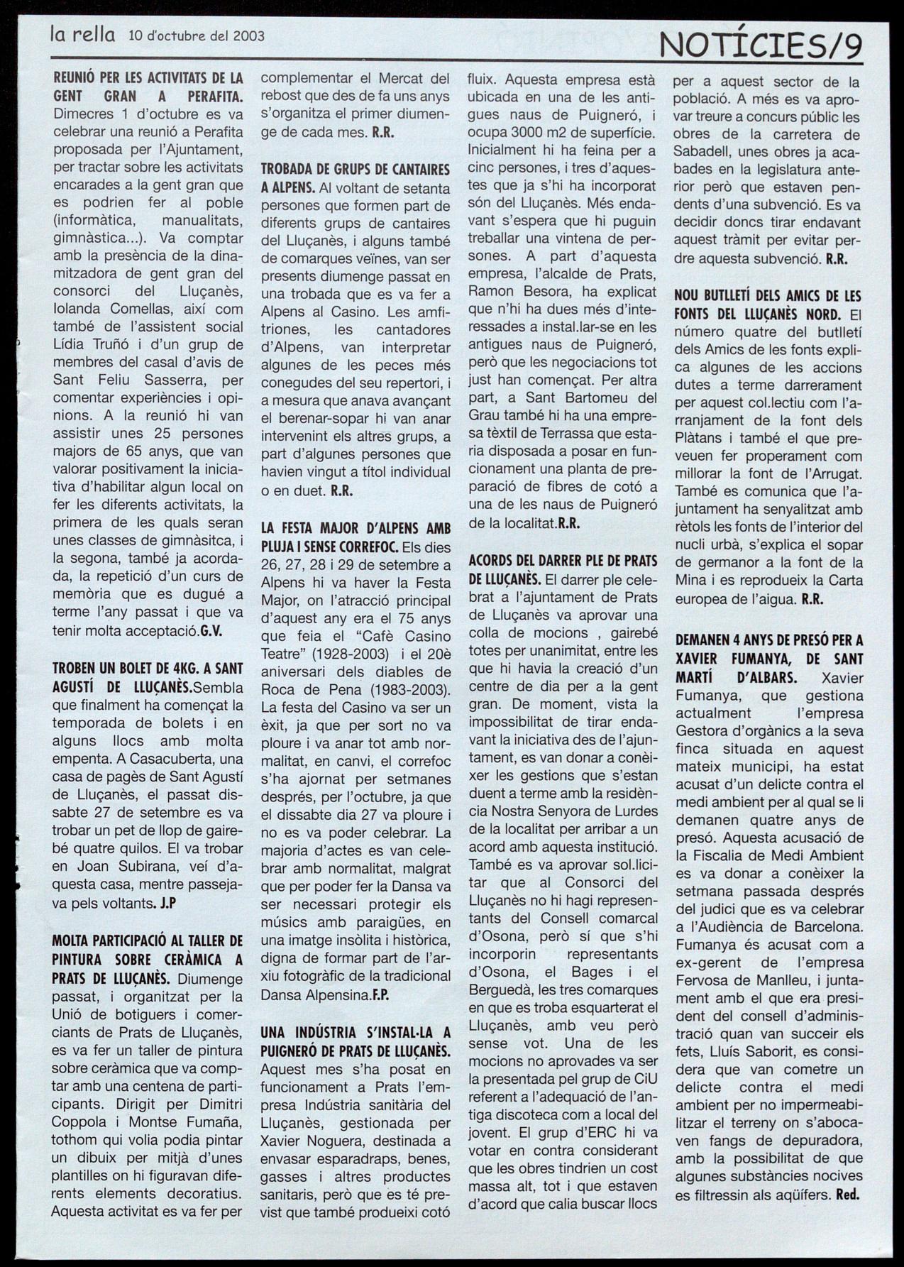 Corresponsals: Aina Arboix (Olost), Jordi Pujol (St. Agustí de Lluçanès), Queralt Copellos i Cristina Torras (St. Feliu Sasserra), Gerard Verdaguer (Perafita), Xavier Crespiero (lo Torre d'Oristà), Morta Girovent (Sant Boi de Lluçanès), Lluís Bosoms i Francesc Pardo (Alpens), Montserrat Vila (Santa Creu de Joglars), Mercè Sabata (Merlès).