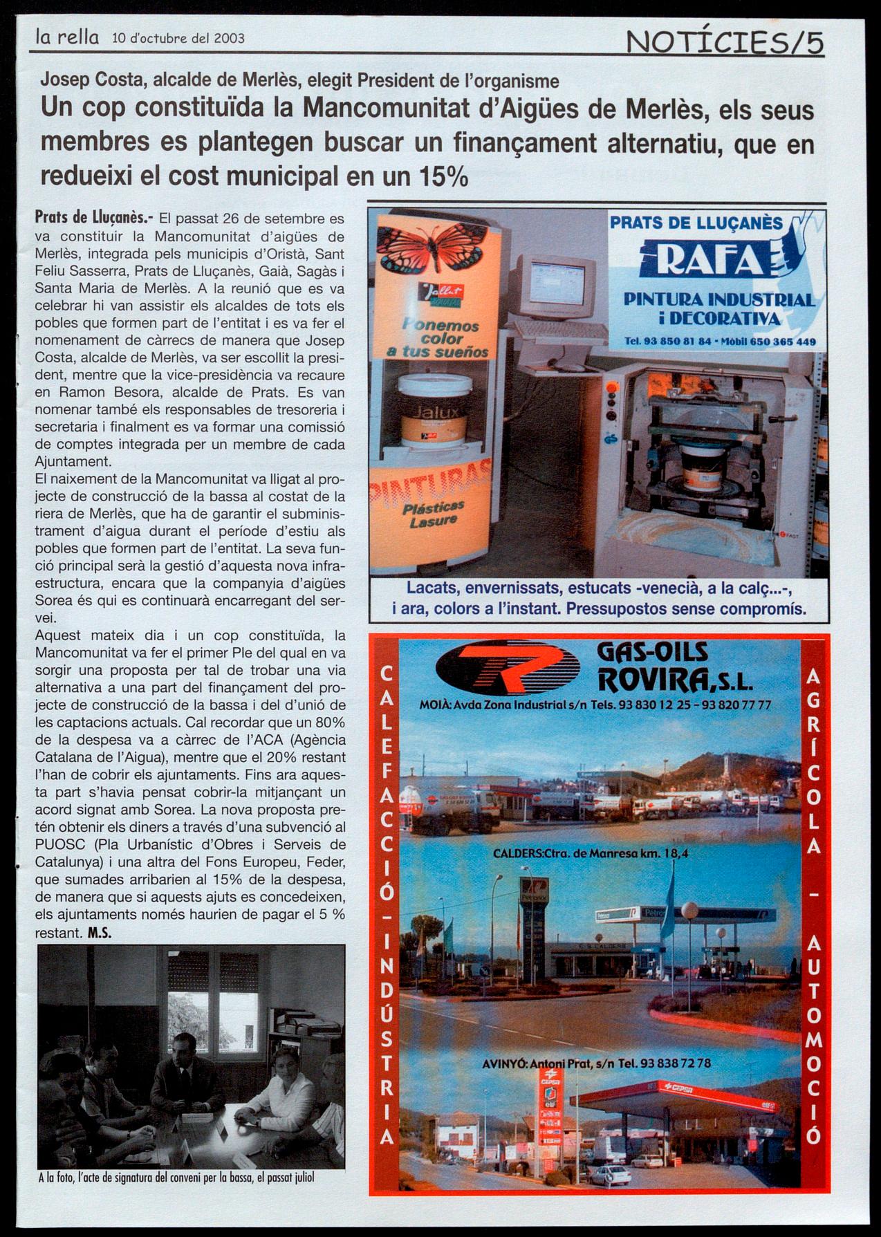 Prats de Lluçanès.- El passat 26 de setembre es va constituir la Mancomunitat d'aigües de Merlès, integrada pels municipis d'Oristà, Sant Feliu Sasserra, Prats de Lluçanès, Gaià, Sagàs i Santa Maria de Merlès. A la reunió que es va celebrar hi van assistir els alcaldes de tots els pobles que formen part de l'entitat es va fer el nomenament de càrrecs de manera que Josep Costa, alcalde de Merlès, va ser escollit la president, mentre que la vice-presidència va recaure en Ramon Besora, alcalde de Prats. Es van nomenar també els responsables de tresoreria secretaria i finalment es va formar una comissió de comptes integrada per un membre de cada Ajuntament.