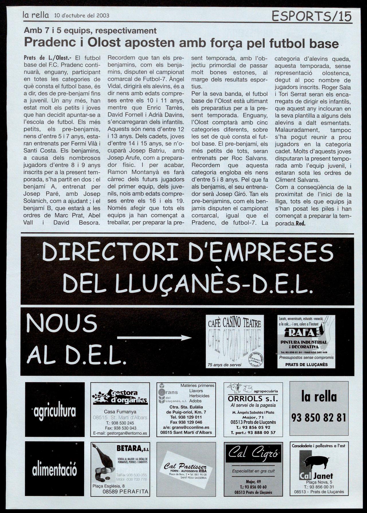 Prats de L./Olost.- El futbol base del F.C. Pradenc contínuarà, enguany, participant en totes les categories de què consta el futbol base, és a dir, des de pre-benjamí fins a juvenil. Un any més, han estat molt els petits joves que han decidit apuntar-se a l'escola de futbol. Els més petits, els pre-benjamis, nens d'entre 5 7 anys, estaran entrenats per Fermí Vilà i Santi Costa. Els benjamins, a causa dels nombrosos jugadors d'entre 8 i 9 anys inscrits per a la present temporada, s'ha partit en dos: el benjamí A, entrenat per Josep Paré, amb Josep Solanich, com a ajudant; el benjamí B, que estarà a les ordres de Marc Prat, Abel Vall David Besara.