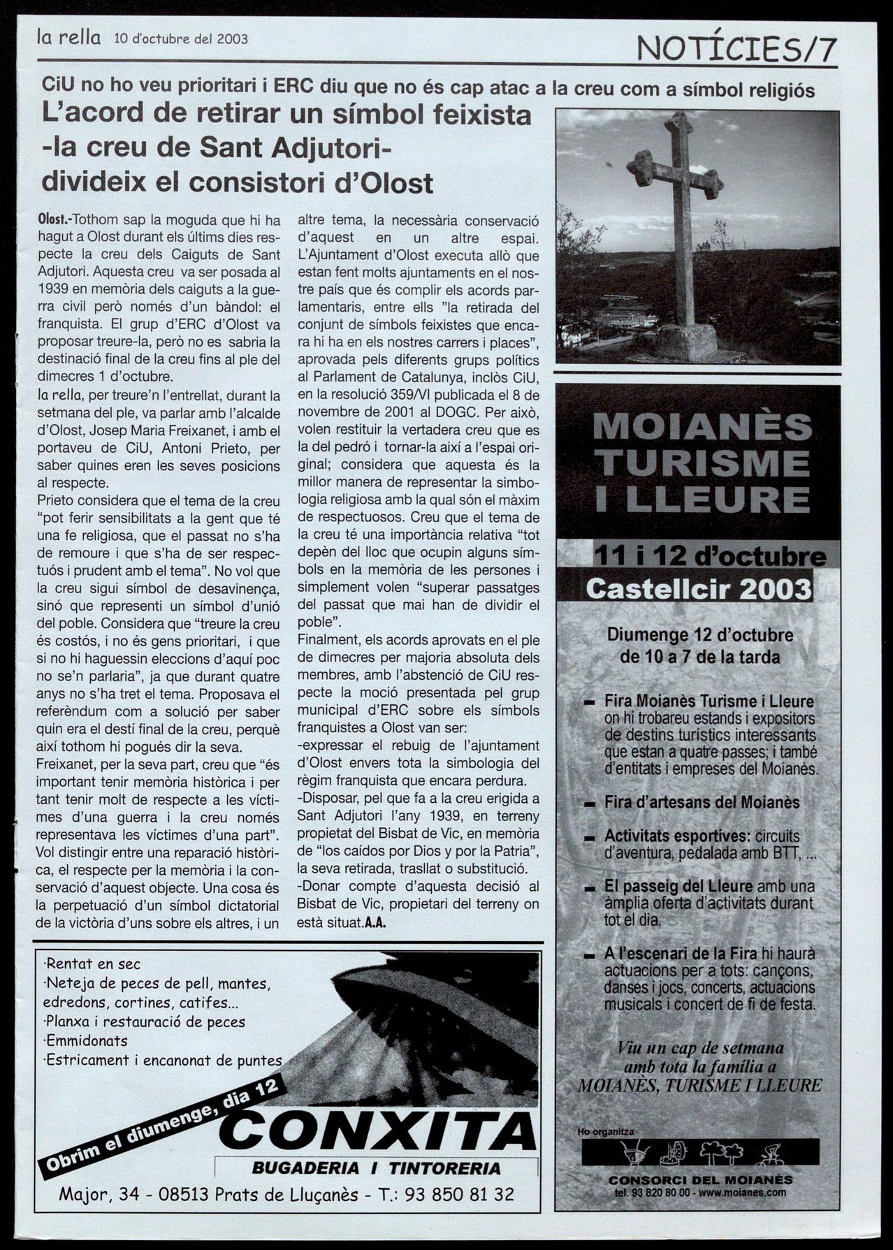 OIOSI.-Tothom sap la moguda que hi ha hagut a Olost durant els últims dies respecte la creu dels Caiguts de Sant Adjutori. Aquesta creu va ser posada al 1939 en memòria dels caiguts a la guerra civil però només d'un bàndol: el franquista. El grup d'ERC d'Olost va proposar treure-la, però no es sabria la destinació final de la creu fins al ple del dimecres 1 d'octubre. la rella, per treure'n t'entrellat, durant la setmana del ple, va parlar amb l'alcalde d'Olost, Josep Maria Freixanet, amb el portaveu de CiU, Antoni Prieto, per saber quines eren les seves posicions al respecte.