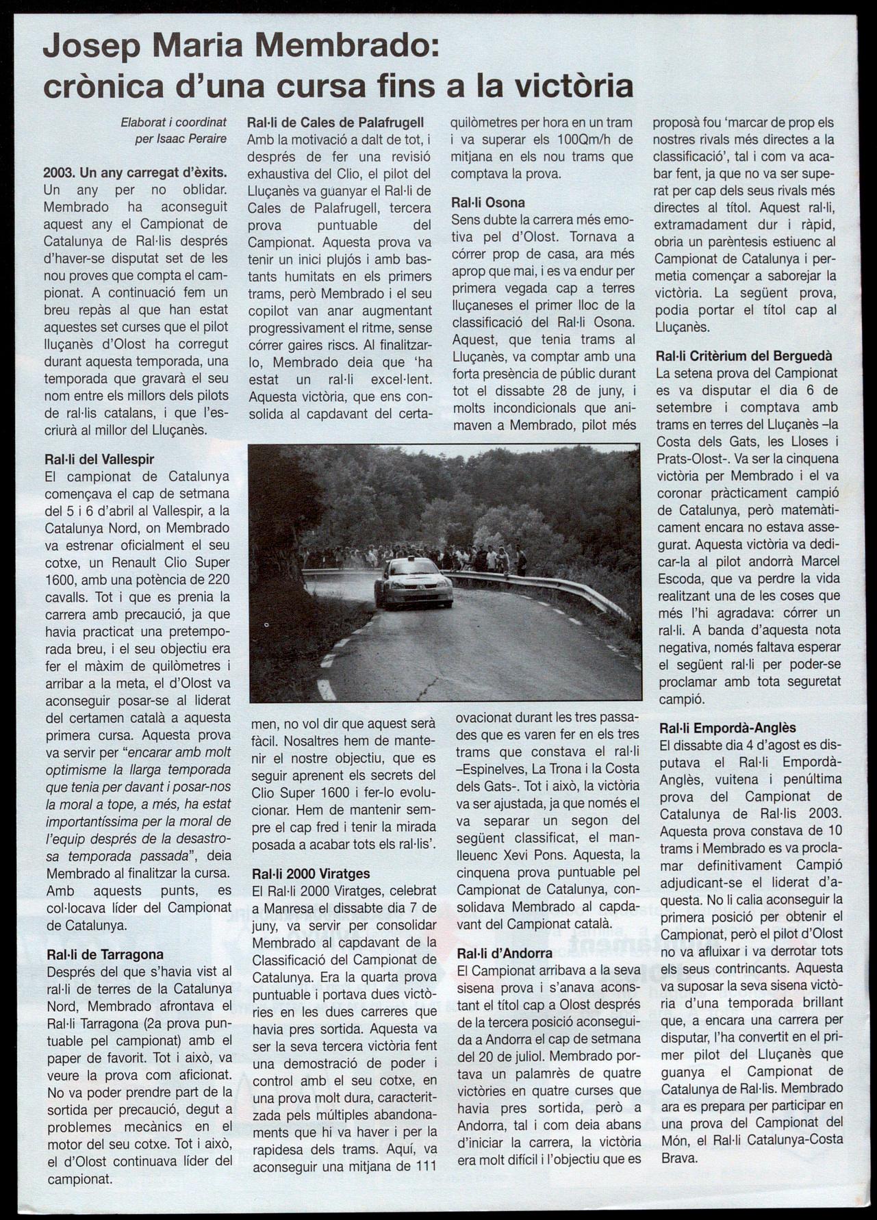 Ral·li Empordà-Anglès El dissabte dia 4 d'agost es disputava el Ral·li EmpordàAnglès, vuitena penúltima prova del Campionat de Catalunya de Ral·lis 2003. Aquesta prova constava de 10 trams i Membrado es va proclamar definitivament Campió adjudicant-se el liderat d'aquesta. No li calia aconseguir la primera posició per obtenir el Campionat, però el pilot d'Olost no va afluixar va derrotar tots els seus contrincants. Aquesta va suposar la seva sisena victòria d'una temporada brillant que, a encara una carrera per disputar, l'ha convertit en el primer pilot del Lluçanès que guanya el Campionat de Catalunya de Ral·lis. Membrado ara es prepara per participar en una prova del Campionat del Món, el Ral·li Catalunya-Costa Brava.