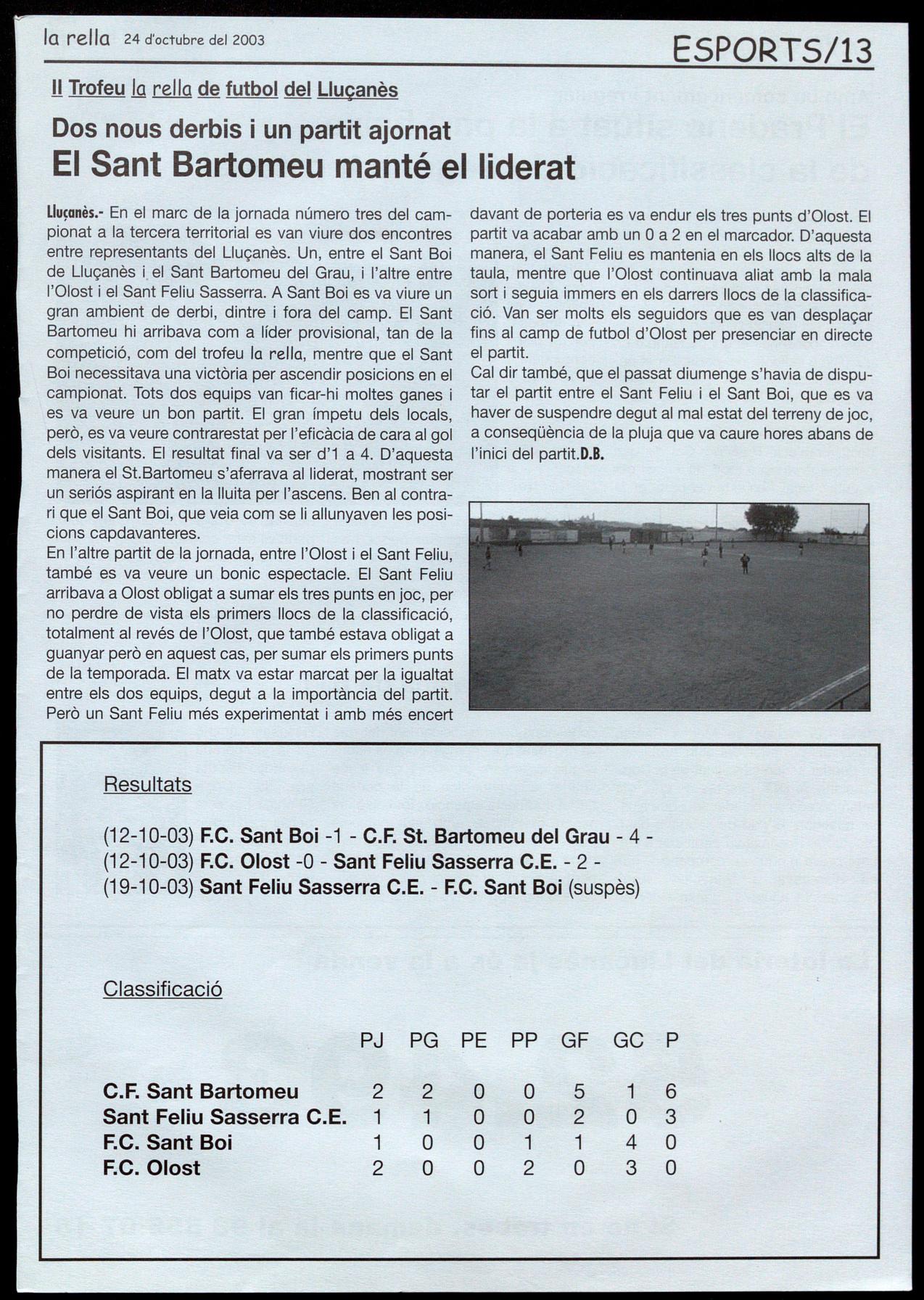 (12-10-03) F.C. Sant Boi -1 - C.F. St. Bartomeu del Grau - 4(12-10-03) F.C. Olost -O - Sant Feliu Sasserra C.E. - 2(19-10-03) Sant Feliu Sasserra C.E. - F.C. Sant Boi (suspès)