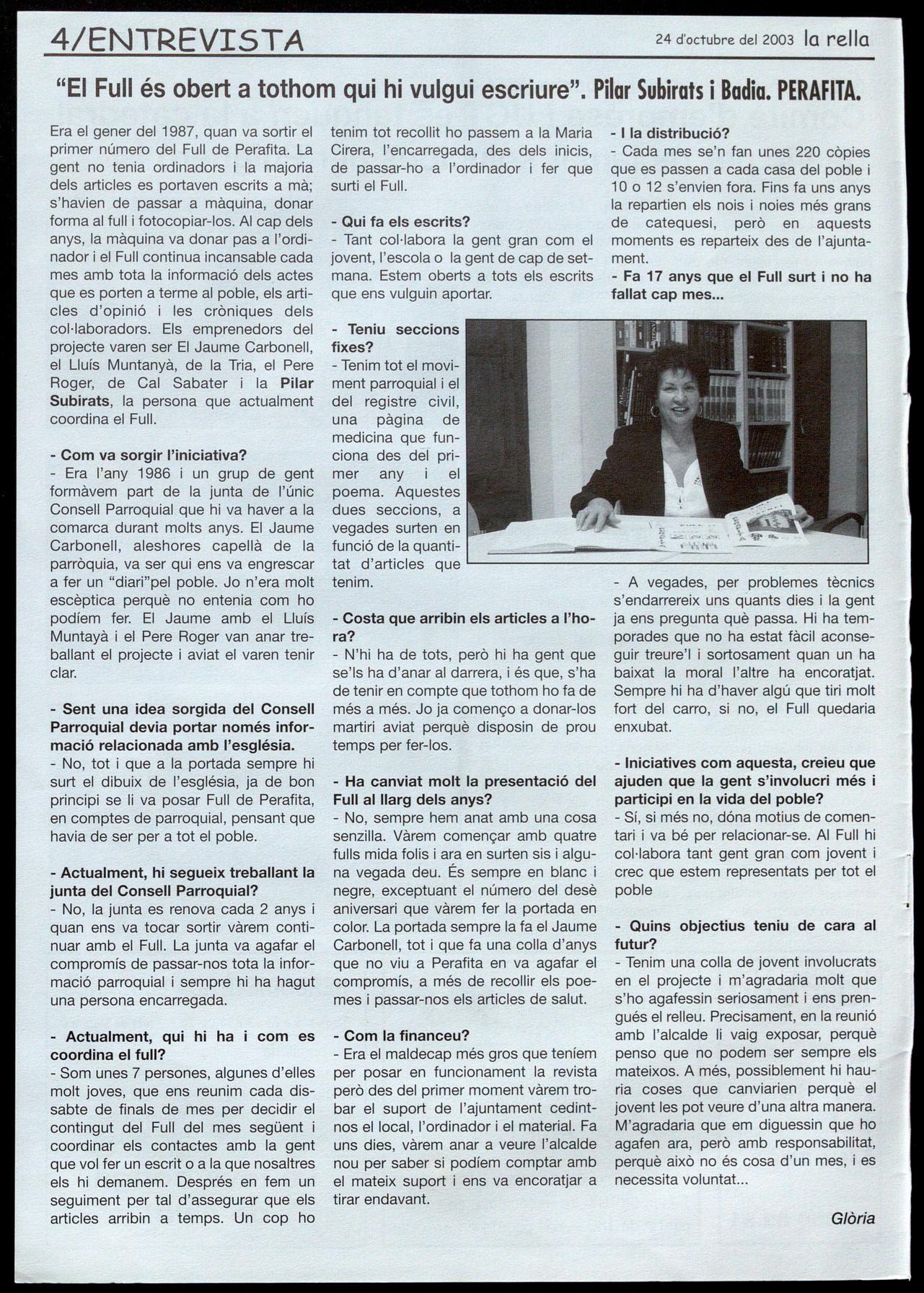 "El Full és obert a tothom qui hi vulgui escriure". Pilar Subirats i Badia. PERAFITA.