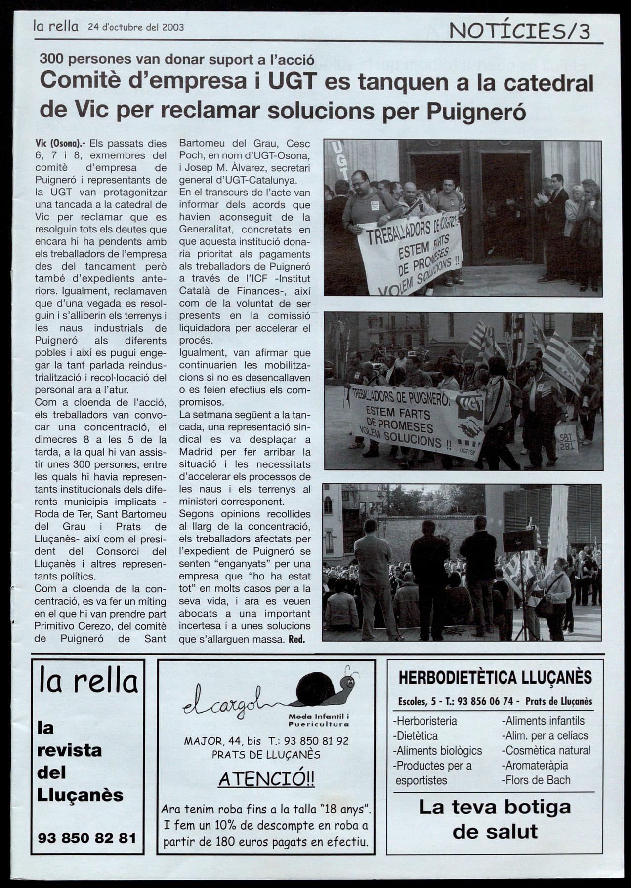 Vic (Osona).- Els passats dies 6, 7 i 8, exmembres del comitè d'empresa de Puigneró representants de la UGT van protagonitzar una tancada a la catedral de Vic per reclamar que es resolguin tots els deutes que encara hi ha pendents amb els treballadors de l'empresa des del tancament però també d'expedients anteriors. Igualment, reclamaven que d'una vegada es resolguin i s'alliberin els terrenys i les naus industrials de Puigneró als diferents pobles i així es pugui engegar la tant parlada reindustrialització recol·locació del personal ara a l'atur.