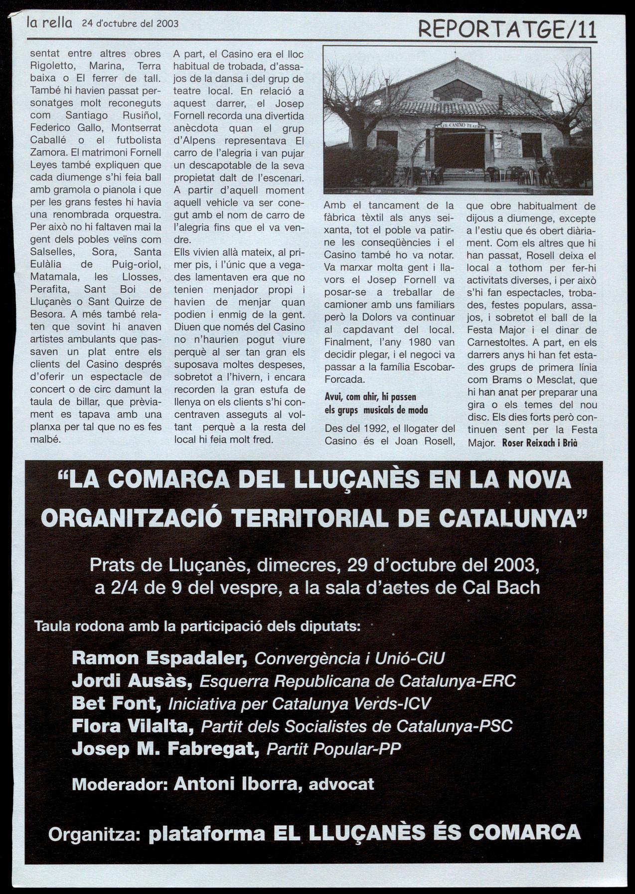 Prots de Uucanès.- "La comarca del Lluçanès en la nova organització territorial de Catalunya". Taula rodona amb la presència de Ramon Espadaler, CiU; Jordi Ausàs ERC; Bet Font, ICV; Flor� Vilalta, PSC-CpC; i Josep M. Fabregat, PP. Moderarà Antoni Iborra, advocat. A 2/4 de 9 del vespre, a la sala d'actes de Cal Bach Organitza, plataforma "El Uuçanès és comarca".