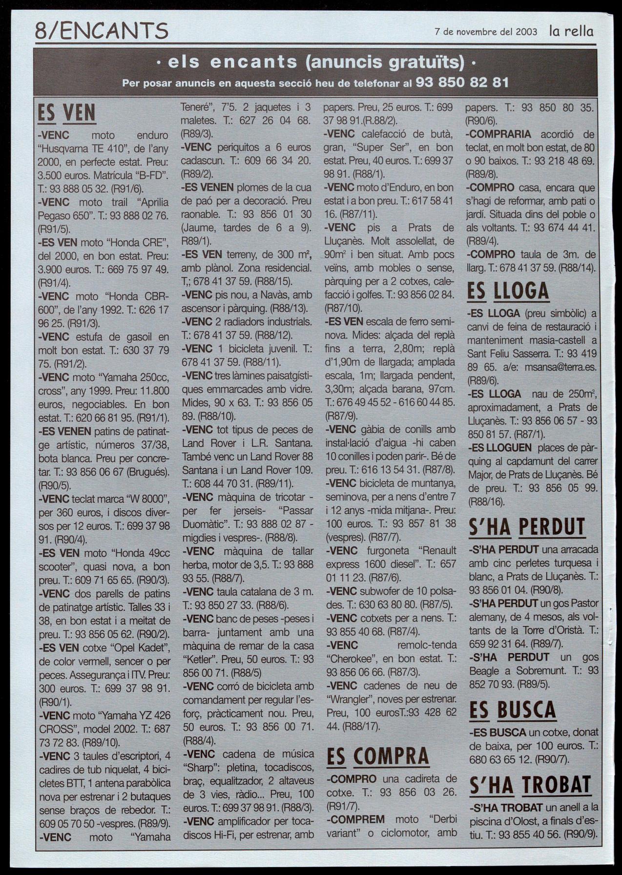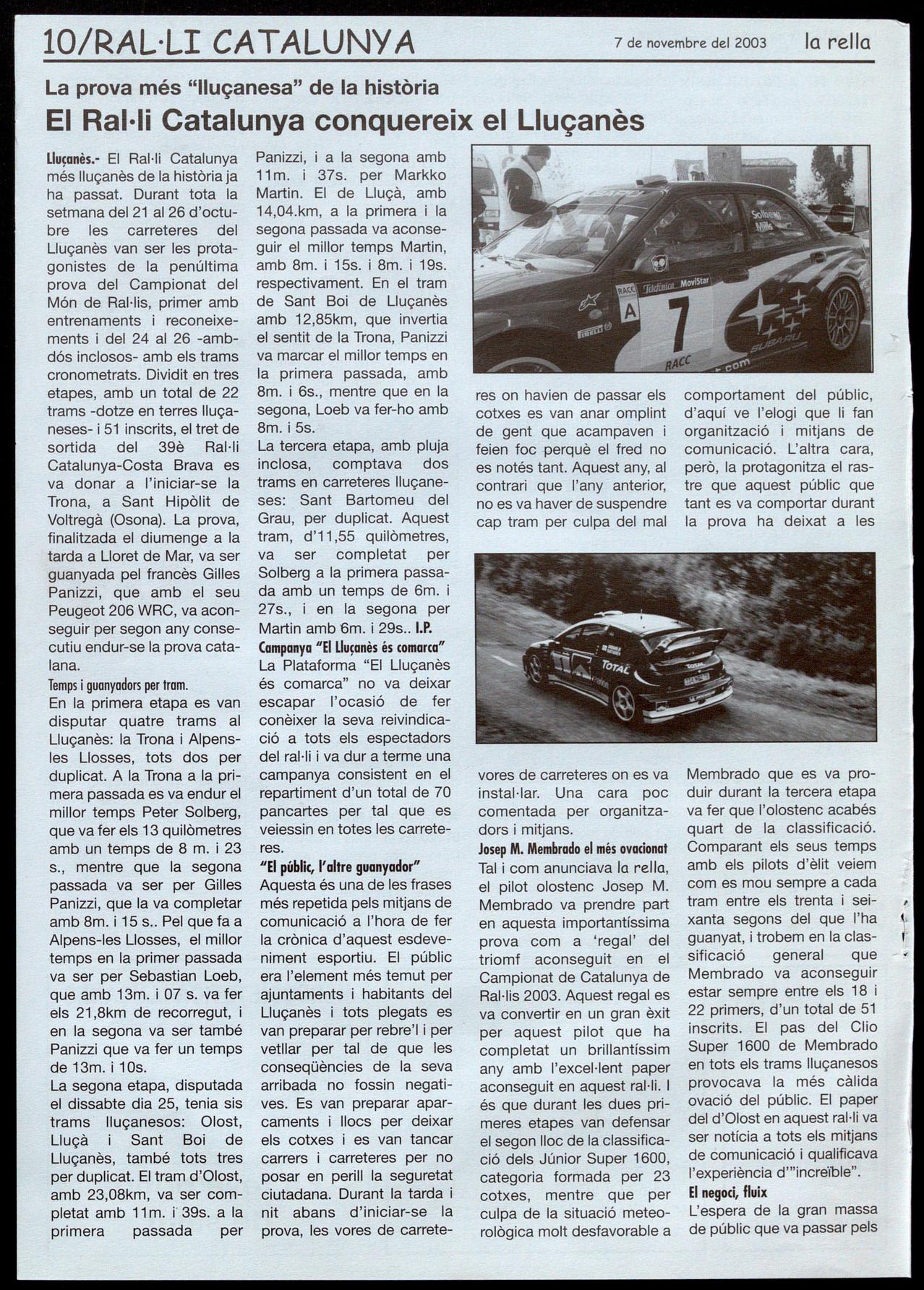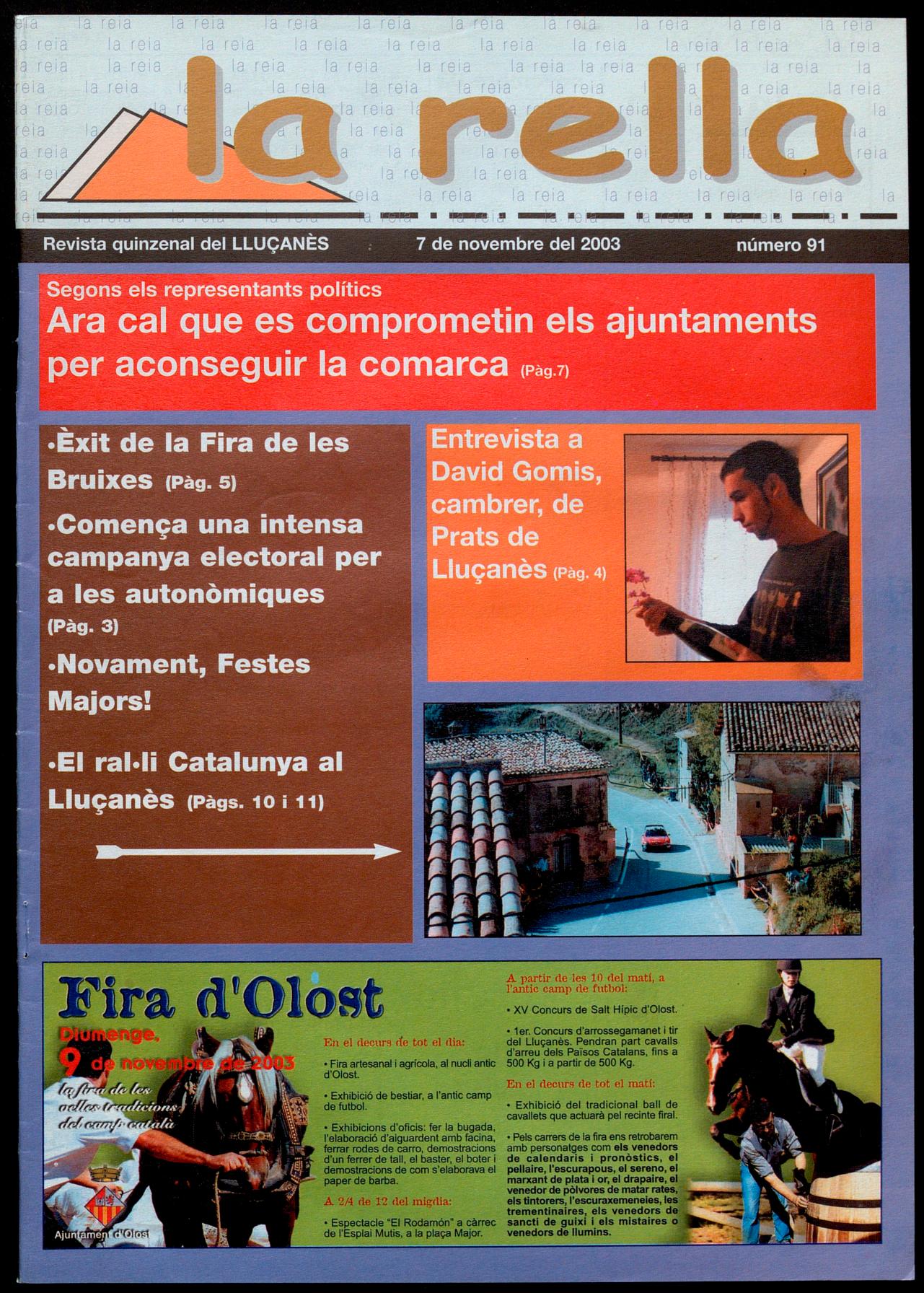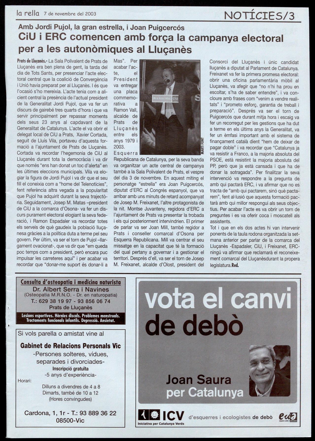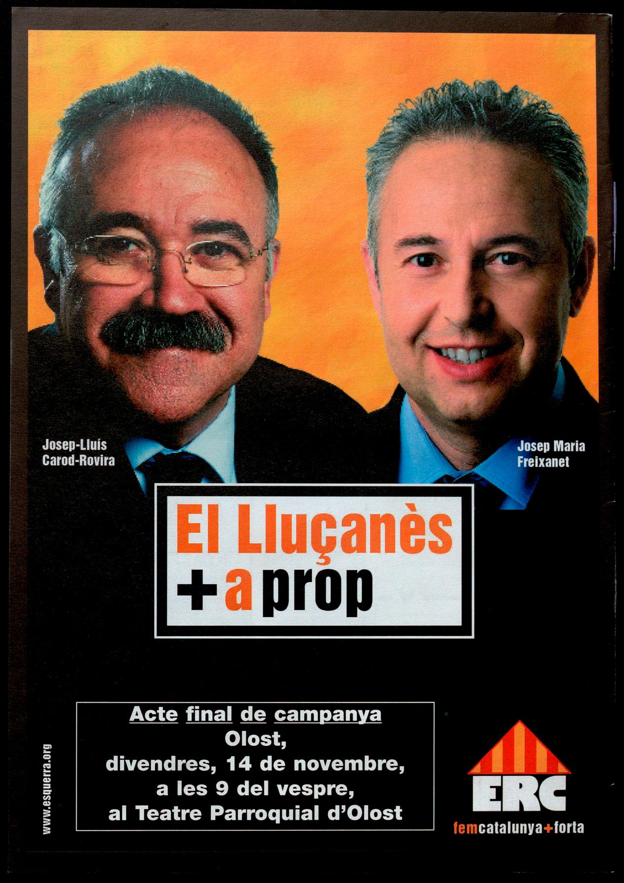 El dia 25 de maig va significar un canvi polític important per al Lluçanès. Els ciutadans d'Olost, Alpens, Lluçà, Sant Boi i Prats, varen apostar pel canvi després de 24 anys de governs de CiU. Sant Feliu Sasserra va continuar donant suport a un canvi efectuat 4 anys abans. Les forces progressistes es van imposar als pobles més grans de la comarca, i Esquerra Republicana de Catalunya va aconseguir cotes de govern que no s'hal vien donat des de la Segona República. D'aquí a uns dies, el 16 de novembre, votarem per escollir la composició del Parlament i, per tant, votarem per escollir els diputats que elegiran el President de Catalunya. És una altra cita clau, on els habitans del Lluçanès de tot Catalunya ens tornem a jugar les garrofes a les urnes. Després de 23 anys de CiU i Jordi Pujol, ara hem d'apostar, segons diuen els partits grans, pel 'continuïsme' de Mas, a pel 'canvi' de Maragall. CiU diu als seus electors que votar ERC es votar Maragall. ¿Com pot dir un partit que en els darrers vuit anys ha governat amb el PP, que ha fet president del govern espanyol José Maria Aznar, acusar-nos a nosaltres d'una cosa que encara no hem fet? El PSC està massa lligat al PSOE com per voler de socis a "los independentistas de ERC", i no crec que 'Mantilles', 'Corbachos' i 'companyia' vulguin anar massa lluny en l'autogovern de Catalunya. Però el que no saben CiU i PSC (i no en parlem del PP), és que Esquerra Republicana de Catalunya té un programa propi, un perfil de partit honest i treballador demostrat dia a dia als diferents ajuntaments on governa, un catalanisme no lligat als grans lobbies econòmics ni interessos empresarials, i el que és més important: una gent preparada per governar. Som un partit preparat per governar. Ara hem de ser valents, hem de tornar a apostar fort, hem de demostrar que volem un canvi real. Hem de votar Esquerra Republicana de Catalunya.