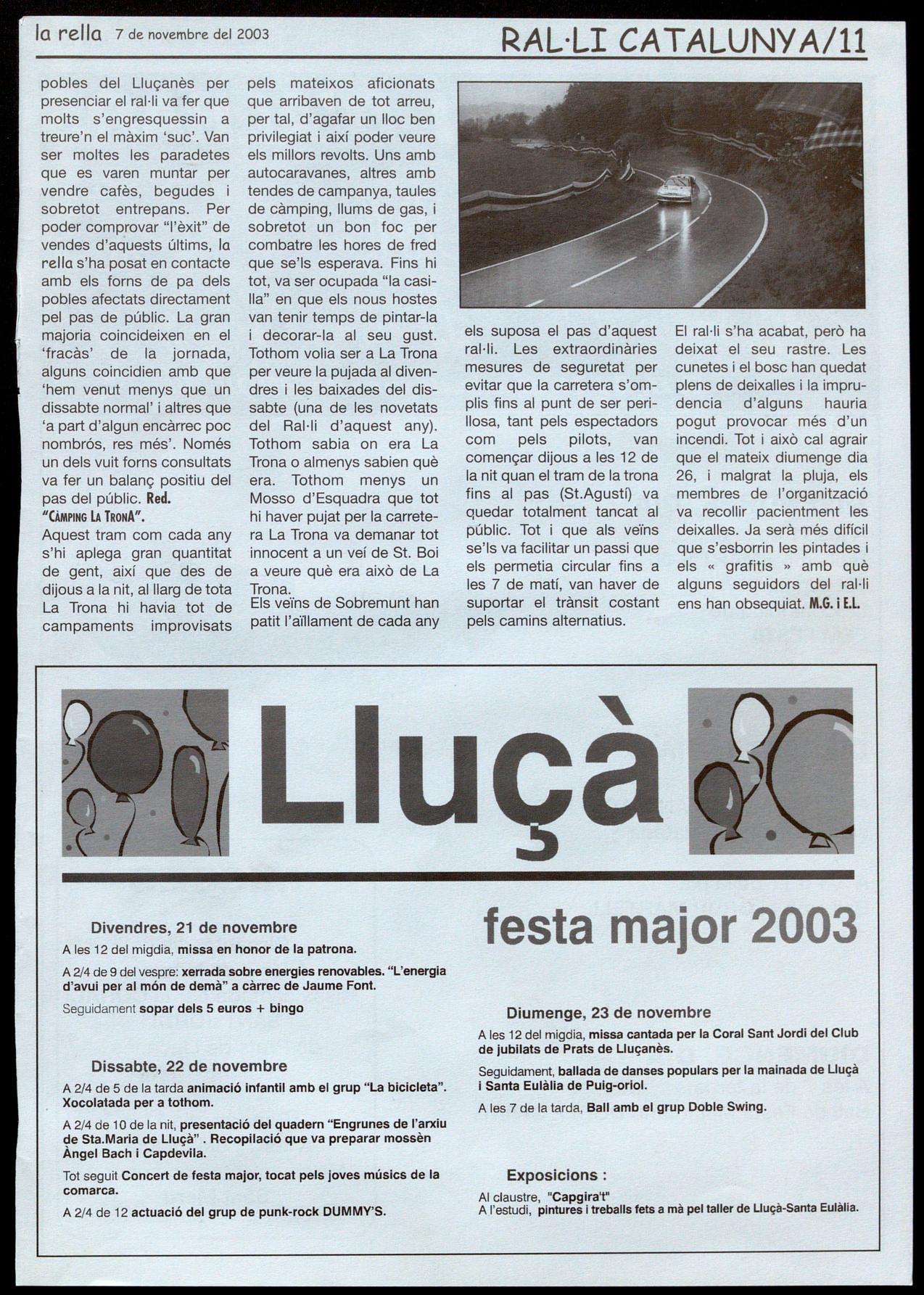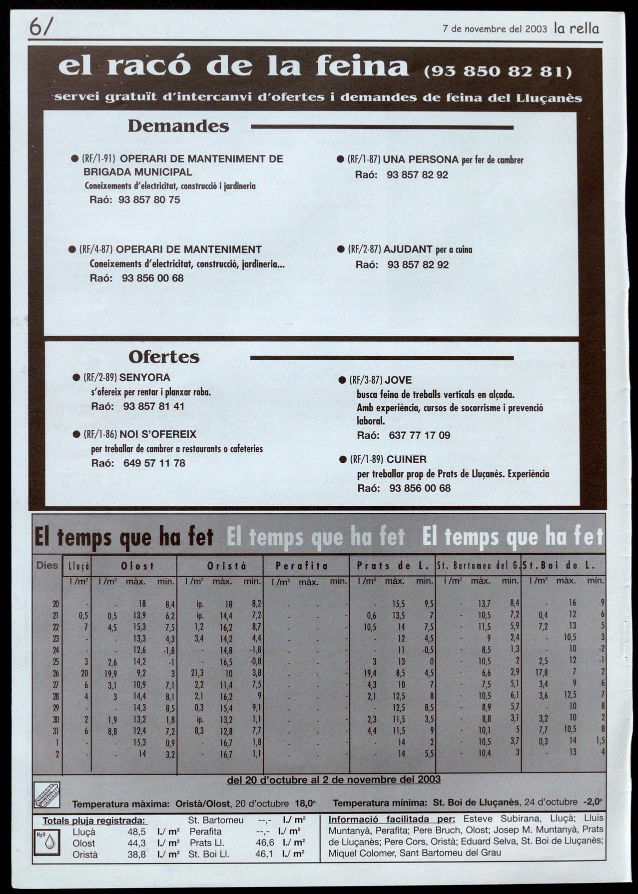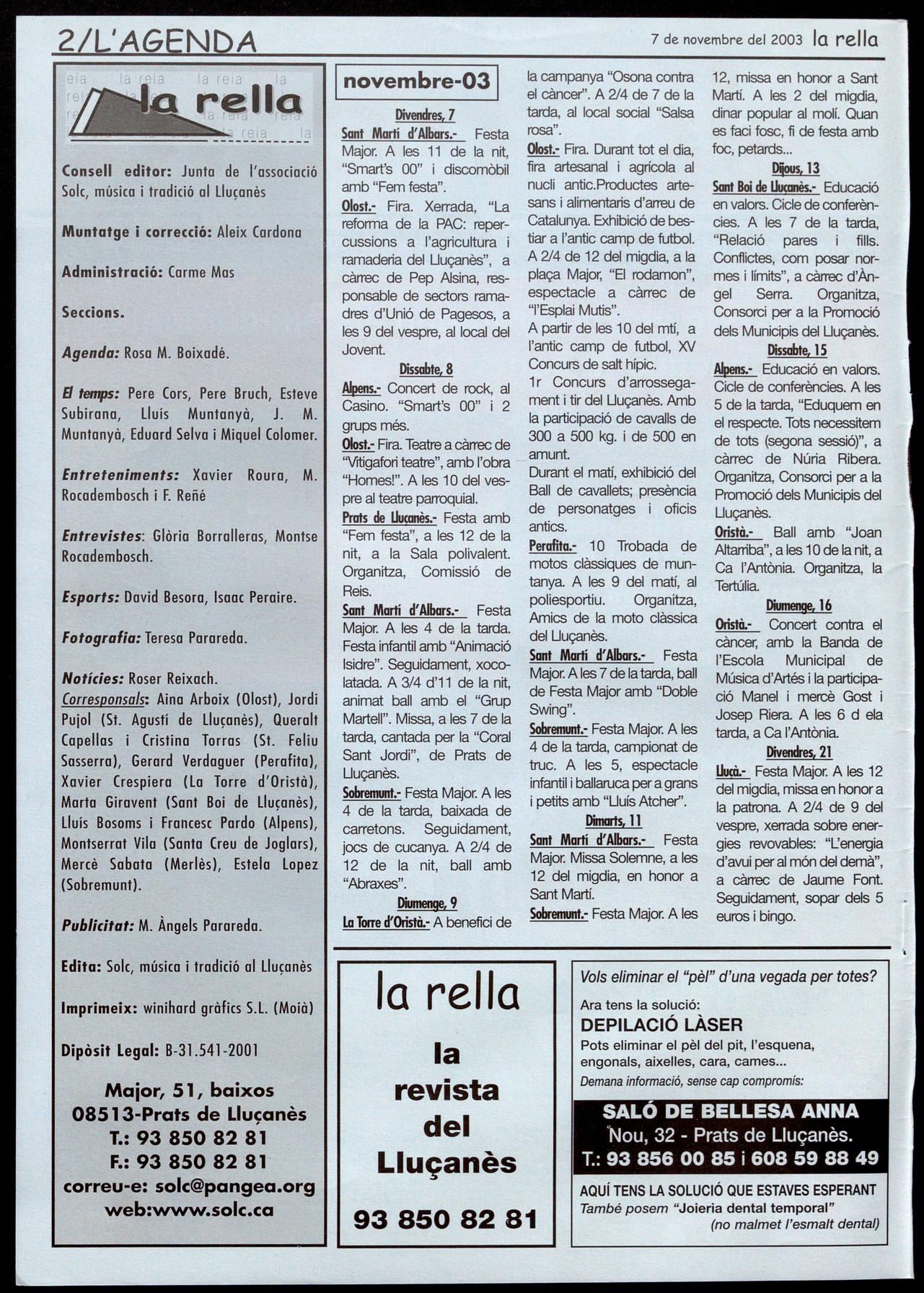 Notícies: Roser Reixoch. (orresponsals: Aina Arboix (Olosl), Jordi Pujol (Sf. Agustí de Lluçanès), Queralt Copellos i Cristina Torras (Sf. Feliu Sasserra), Gerard Verdaguer (Perafita), Xavier Crespiero (lo Torre d'Oristà), Morta Giravent (Sant Boi de lluçanès), lluís Bosoms i Francesc Pardo (Alpens), Montserrat Vila (Santa Creu de Joglars), Mercè Sabata (Merlès), Estela lopez (Sobremunt).