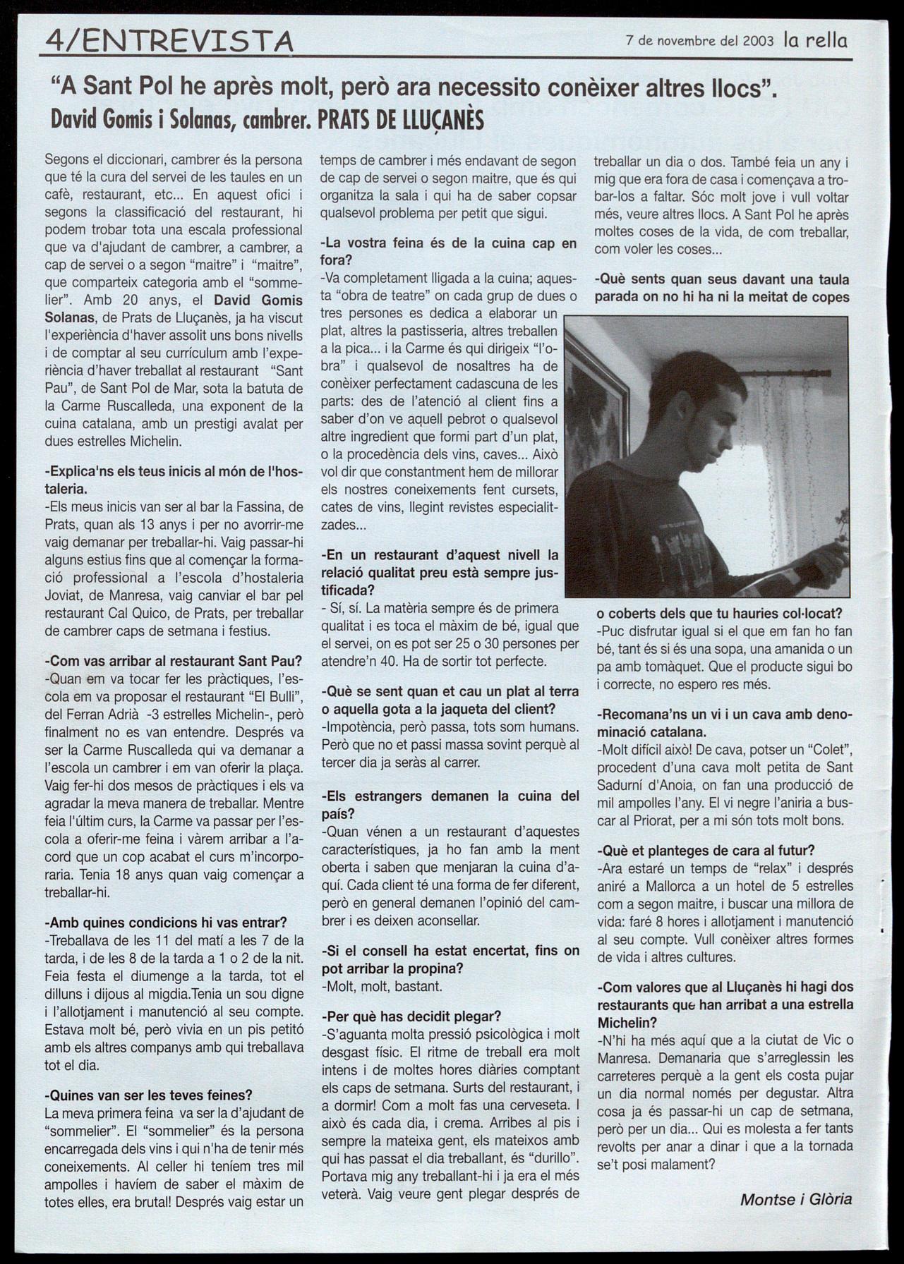 Segons el diccionari, cambrer és la persona que té la cura del servei de les taules en un cafè, restaurant, etc... En aquest ofici i segons la classificació del restaurant, hi podem trobar tota una escala professional que va d'ajudant de cambrer, a cambrer, a cap de servei o a segon "maitre" "maitre", que comparteix categoria amb el "sommelier". Amb 20 anys, el David Gomis Solanas, de Prats de Lluçanès, ja ha viscut l'experiència d'haver assolit uns bons nivells i de comptar al seu currículum amb l'experiència d'haver treballat al restaurant "Sant Pau", de Sant Poi de Mar, sota la batuta de la Carme Ruscalleda, una exponent de la cuina catalana, amb un prestigi avalat per dues estrelles Michelin.