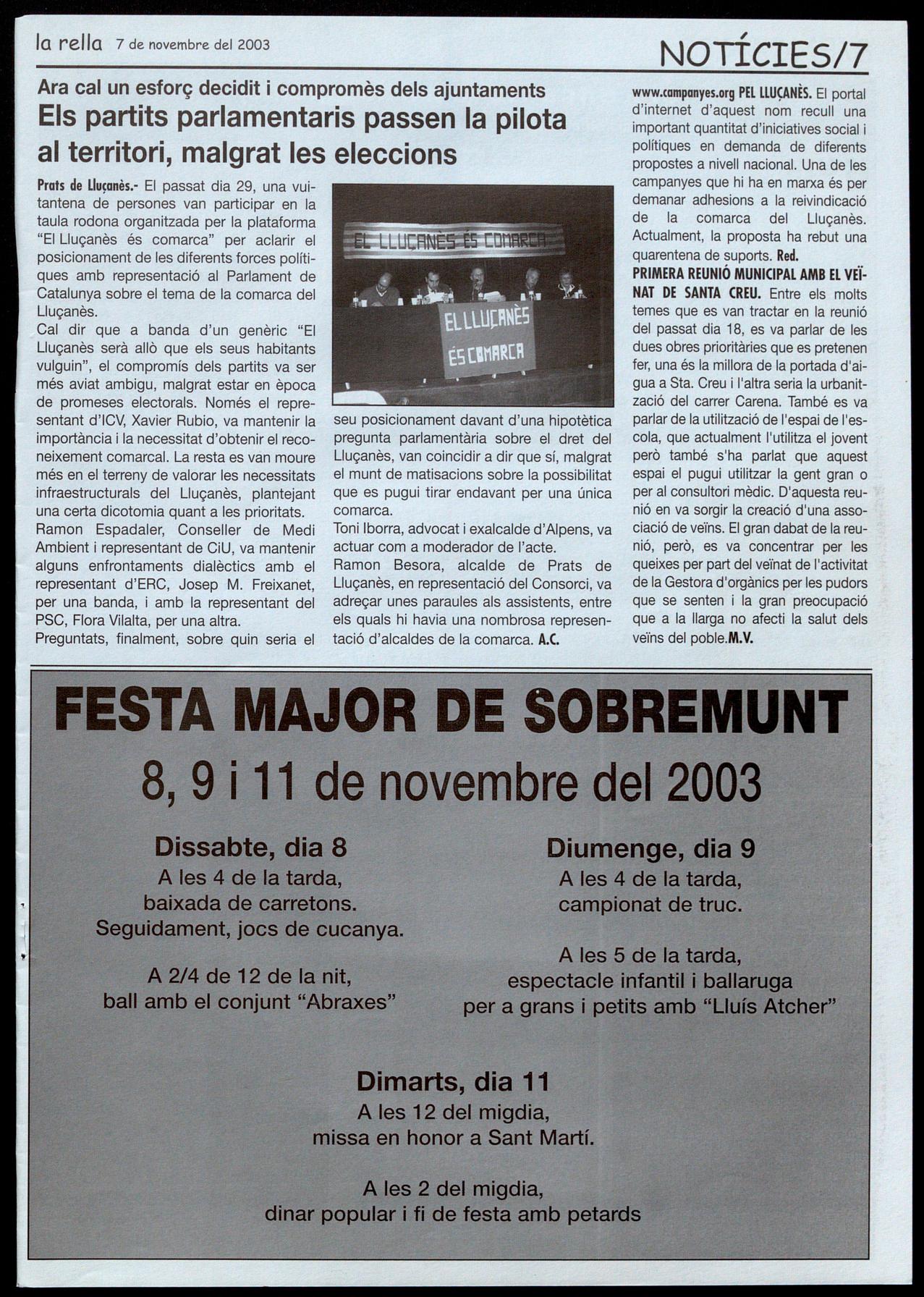 Tot que en els dos actes hi van intervenir ponents de la taula rodona organitzada la setmana anterior per parlar de la comarca del Lluçanès -Espadaler, CiU, Freixanet, ERCningú va afirmar que reclamarà el reconeixement comarcal del Lluçanèsdurant la propera legislatura.Red.