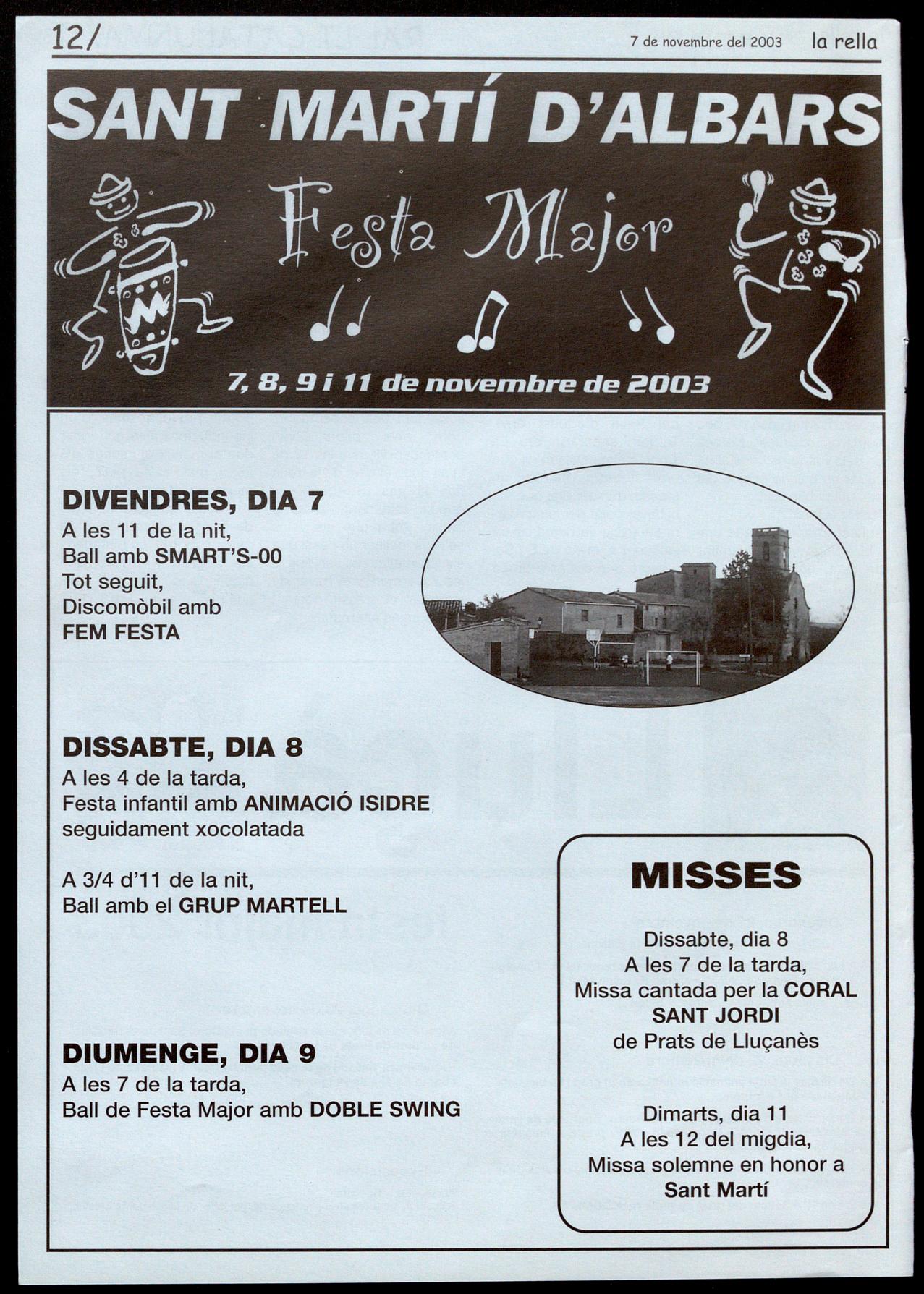 Sant Martí d'A1bars.- Festa Majar. A les 4 de la tarda. Festa infantil amb "Animació Isidre". Seguidament, xocolatada. A 3/4 d'11 de la nit, animat ball amb el "Grup Martell". Missa, a les 7 de la tarda, cantada per la "Coral Sant Jordi", de Prats de Uuçanès.