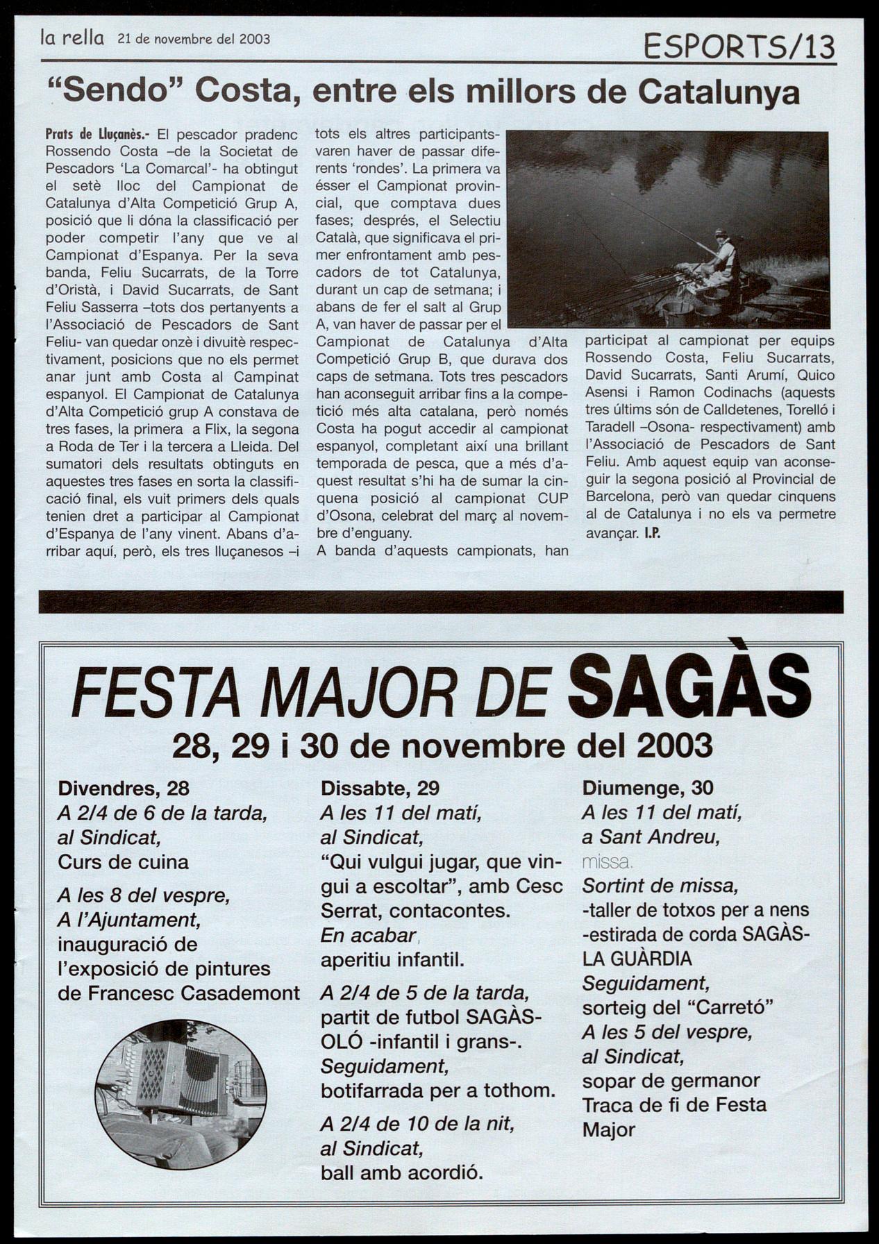 Prats de Llusanès.- El pescador pradenc tots els altres participantsRossendo Costa -de la Societat de varen haver de passar difePescadors 'La Comarcal'- ha obtingut rents 'rondes'. La primera va el setè lloc del Campionat de ésser el Campionat provinCatalunya d'Alta Competició Grup A, cial, que comptava dues posició que li dóna la classificació per fases; després, el Selectiu poder competir l'any que ve al Català, que significava el priCampionat d'Espanya. Per la seva mer enfrontament amb pesbanda, Feliu Sucarrats, de la Torre cadors de tot Catalunya, d'Oristà, i David Sucarrats, de Sant durant un cap de setmana; Feliu Sasserra -tots dos pertanyents a abans de fer el salt al Grup l'Associació de Pescadors de Sant A, van haver de passar per el Feliu- van quedar onzè divuitè respec- Campionat de Catalunya d'Alta tivament, posicions que no els permet Competició Grup B, que durava dos anar junt amb Costa al Campinat caps de setmana. Tots tres pescadors espanyol. El Campionat de Catalunya han aconseguit arribar fins a la comped'Alta Competició grup A constava de tició més alta catalana, però només tres fases, la primera a Flix, la segona Costa ha pogut accedir al campionat a Roda de Ter la tercera a Lleida. Del espanyol, completant així una brillant sumatori dels resultats obtinguts en temporada de pesca, que a més d'aaquestes tres fases en sorta la classifi- quest resultat s'hi ha de sumar la cincació final, els vuit primers dels quals quena posició al campionat CUP tenien dret a participar al Campionat d'Osona, celebrat del març al novemd'Espanya de l'any vinent. Abans d'a- bre d'enguany. rribar aquí, però, els tres lluçanesos -i A banda d'aquests campionats, han