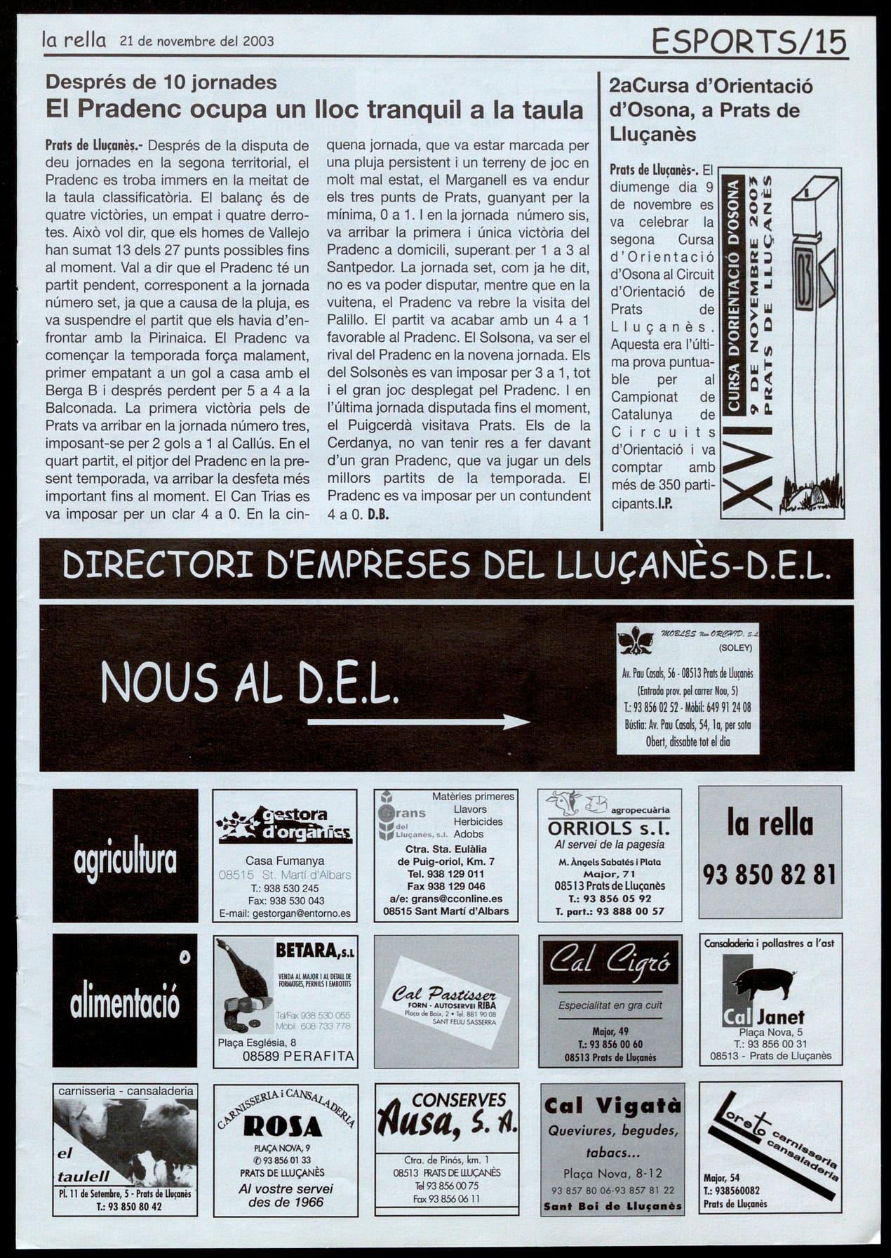 Llu�anès.- El Pradenc de futbol sala, ocupa un dels llocs capdavanters de la Divisió d'Honor de Barcelona. Després de la disputa de 6 jornades, l'equip ha sumat 11 dels 18 punts possibles, amb un balanç de dos empats, tres victòries una sola derrota. En les dues primeres jornades de la competició, el Pradenc va firmar dos empats consecutius, el primer a la seva pista, amb un empat a 1 enfront del St.Gervasi, mentre que el segon empatant a 3, en el seu primer desplaçament. En la tercera jornada, el Pradenc, que va tornar a jugar lluny de la seva pista, va aconseguir la primera victòria, 2 a 3.