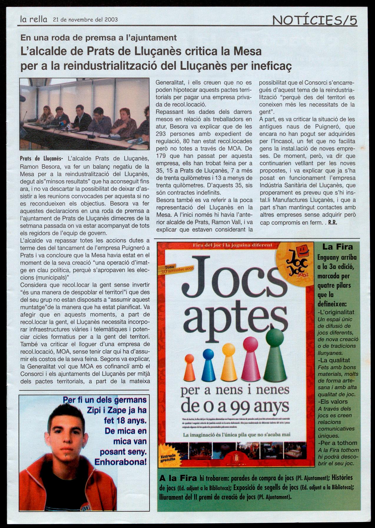 Prats de Lluçanès- L'alcalde Prats de Lluçanès, Ramon Besora, va fer un balanç negatiu de la Mesa per a la reindustralització del Lluçanès, degut als"minsos resultats" que ha aconseguit fins ara, i no va descartar la possibilitat de deixar d'assistir a les reunions convocades per aquesta si no es recondueixen els objectius. Besora va fer aquestes declaracions en una roda de premsa a l'ajuntament de Prats de Lluçanès dimecres de la setmana passada on va estar acompanyat de tots els regidors de l'equip de govern. L'alcalde va repassar totes les accions dutes a terme des del tancament de l'empresa Puigneró a Prats va concloure que la Mesa havia estat en el moment de la seva creació "una operació d'imatge en clau política, perquè s'apropaven les eleccions (municipals)"