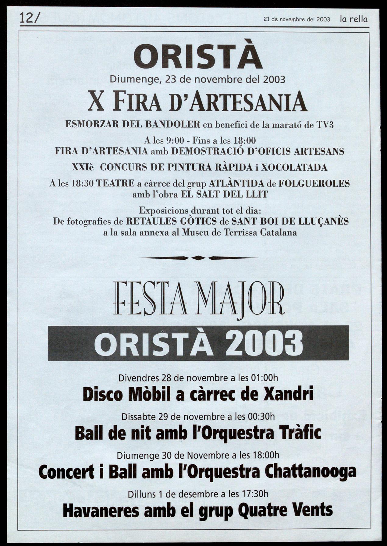 Oristà.- X Fira d'Artesania. A les 8 del matí, esmorzar del Bandoler, en benefici de la Marató de TV3. De les 9 del matí fins a les 6 de la tarda, Fira d'Artesania amb demostració d'oficis artesans. XXlè concurs de pintura ràpida i xocolatada. A 2/4 de 7 del vespre, teatre amb el grup Atlàntida, de Folgueroles (Osona), amb l'obra "El salt del llit". Durant tot el dia, exposició de retaules gòtics de Sant Boi de Lluçanès, a la sala annexa del Museu de Terrissa catalana.