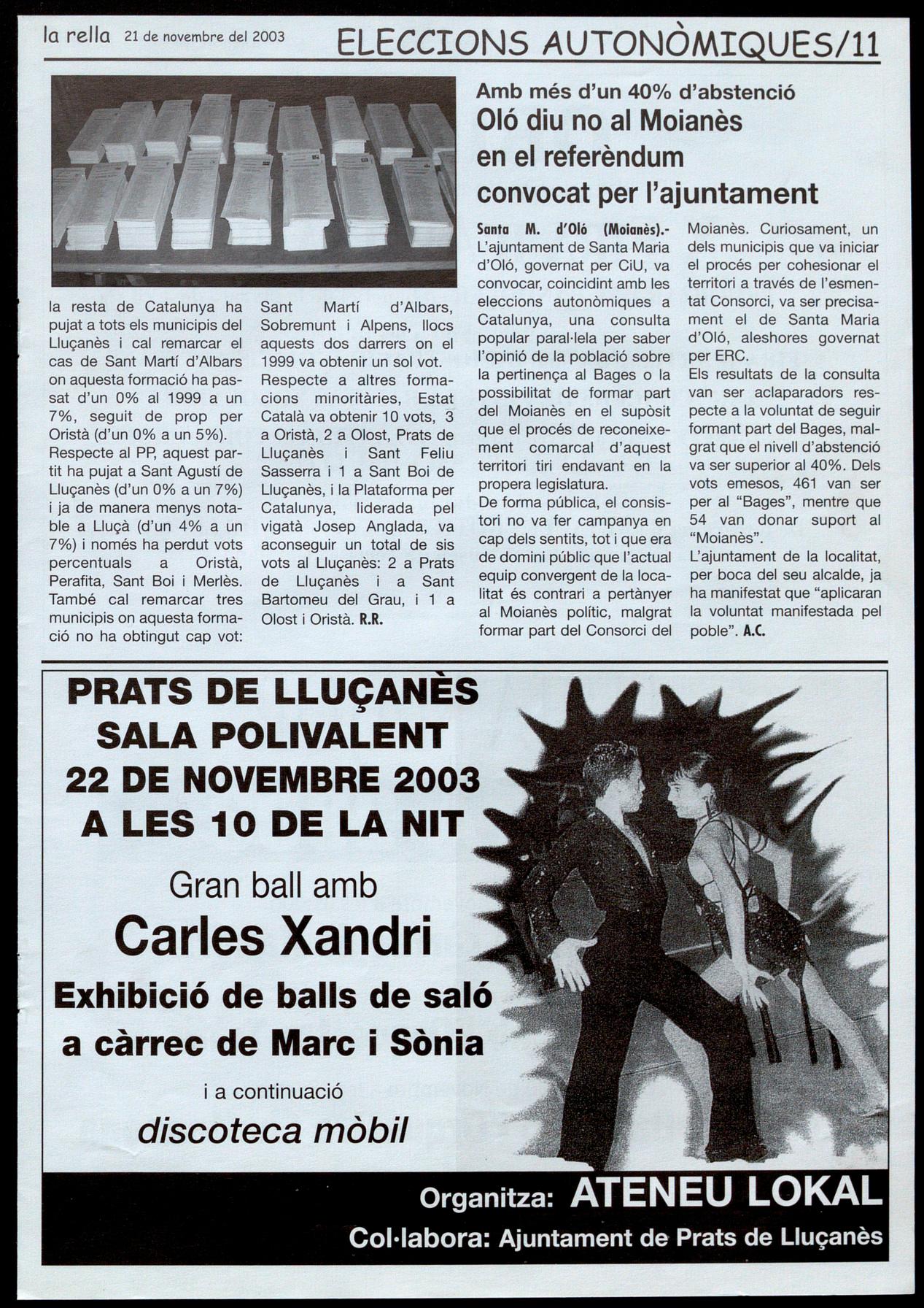 Prats de Uucanès.- Ball amb "Carles Xandri". Exhibició de balls de saló a càrrec de "Marc Sònia". Seguidament, discoteca mòbil. A les 1 O de la nit, a la Sala polivalent.