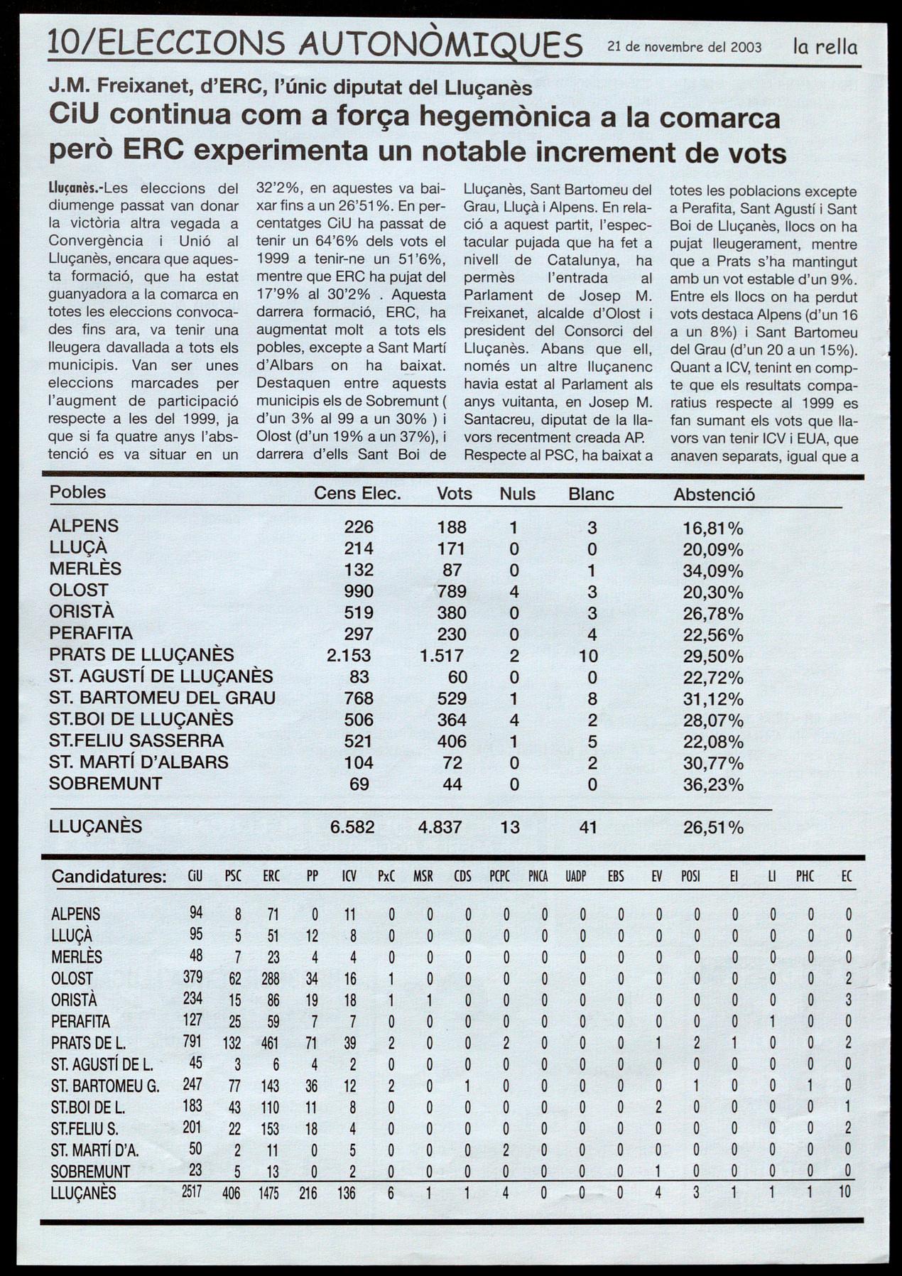 Pujol (St. Agustí de Lluçanès), Queralt Capellas i Cristina Torras (St. Feliu Sasserra), Gerard Verdaguer (Perafita), Xavier Crespiera (Lo Torre d'Oristà), Morta Giravent (Sant Boi de Lluçanès), Lluís Bosoms i Francesc Pardo (Alpens), Montserrat Vila (Santa Creu de Joglars), Mercè Sabata (Merlès), Estela Lopez (Sobremunt).