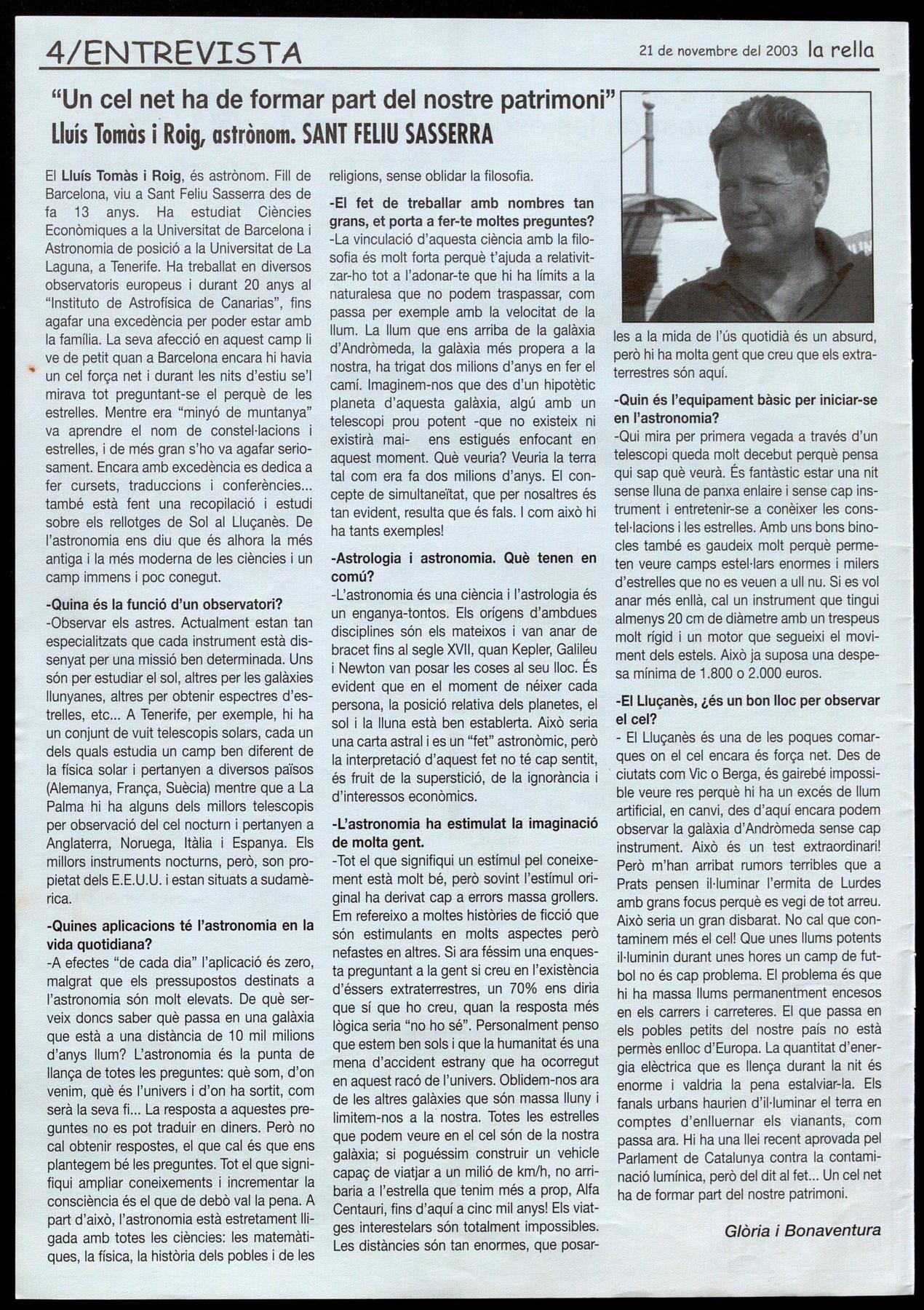 El Lluís Tomàs i Roig, és astrònom. Fill de Barcelona, viu a Sant Feliu Sasserra des de fa 13 anys. Ha estudiat Ciències Econòmiques a la Universitat de Barcelona Astronomia de posició a la Universitat de La Laguna, a Tenerife. Ha treballat en diversos observatoris europeus i durant 20 anys al "Instituto de Astrofísica de Canarias", fins agafar una excedència per poder estar amb la família. La seva afecció en aquest camp li ve de petit quan a Barcelona encara hi havia un cel força net i durant les nits d'estiu se'l mirava tot preguntant-se el perquè de, les estrelles. Mentre era "minyó de muntanya" va aprendre el nom de constel·lacions i estrelles, i de més gran s'ho va agafar seriosament. Encara amb excedència es dedica a fer cursets, traduccions conferències també està fent una recopilació estudi sobre els rellotges de Sol al Lluçanès. De l'astronomia ens diu que és alhora la més antiga la més moderna de les ciències i un camp immens i poc conegut.