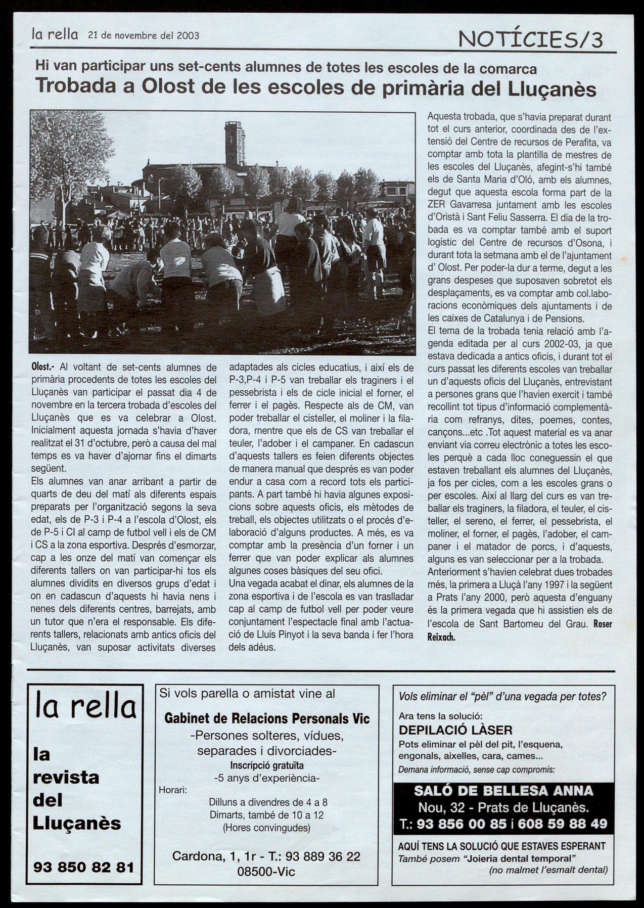 Olost." AI voltant de set-cents alumnes de primària precedents de totes les escoles del Lluçanès van participar el passat dia 4 de novembre en la tercera trobada d'escoles del Lluçanès que es va celebrar a Olost.