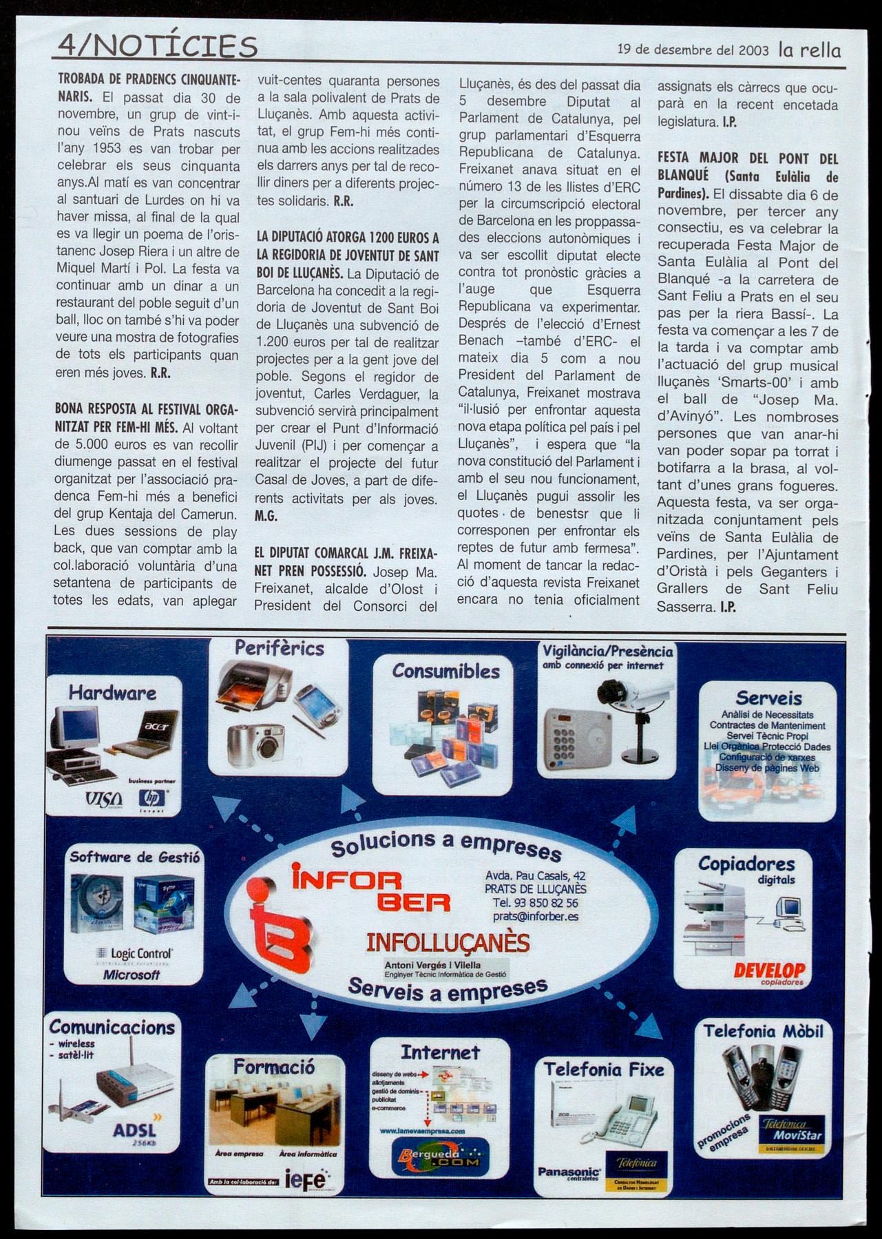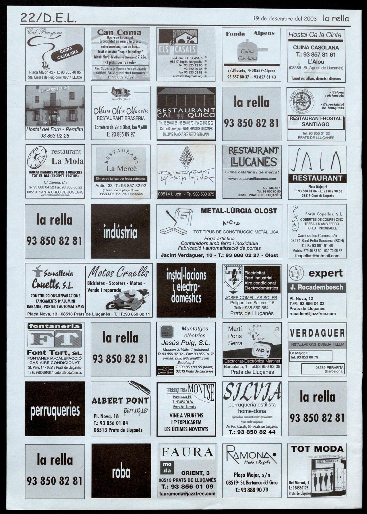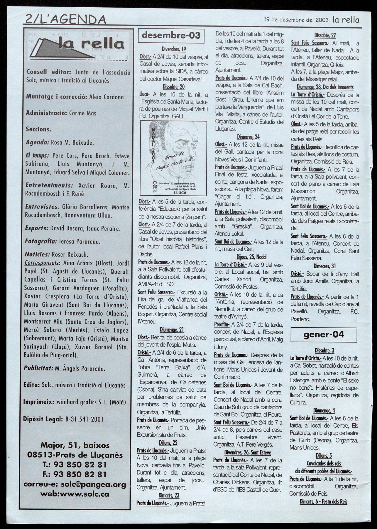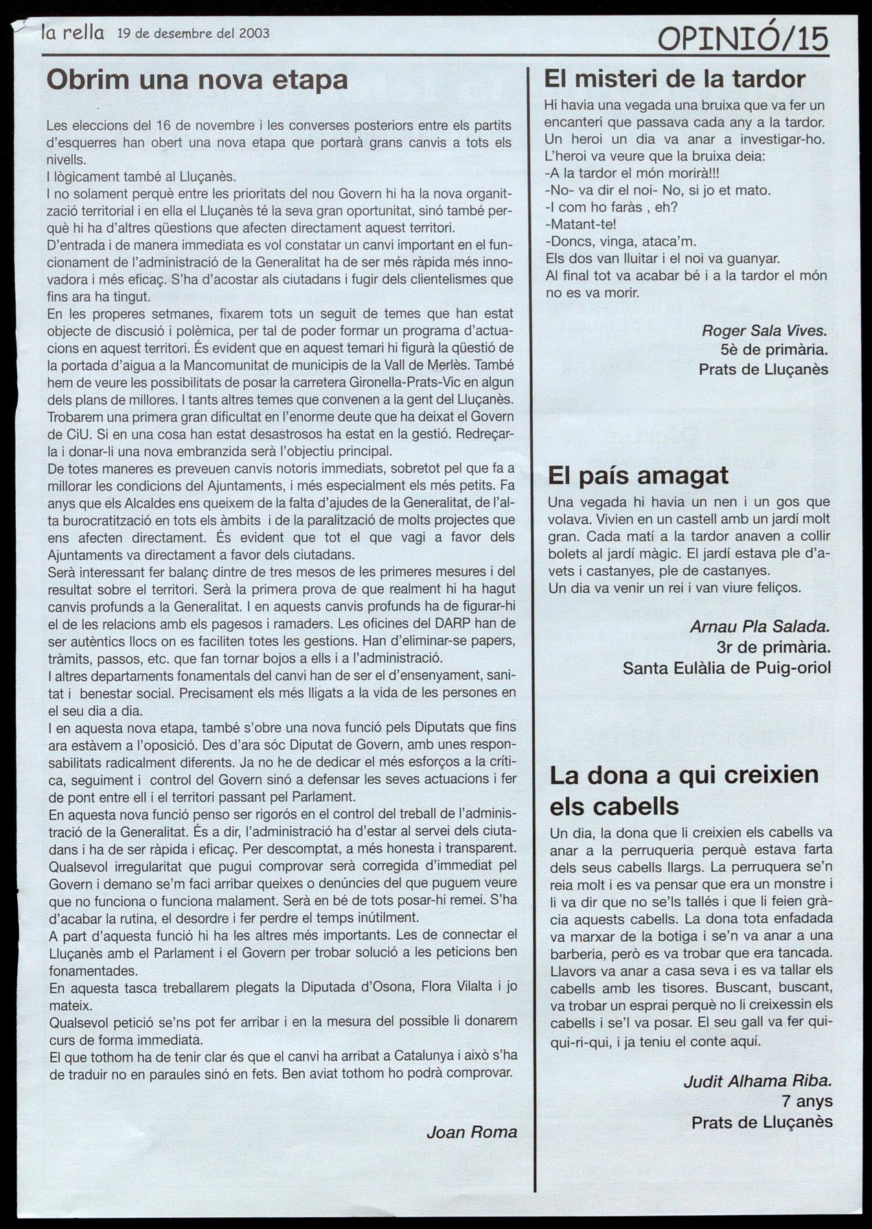 Corresponsals: Aina Arboix (Olost), Jordi Pujol (St. Agustí de lluçanès), Queralt Capellas i Cristina Torras (St. Feliu Sasserra), Gerard Verdaguer (Perafita), Xavier Crespi era (lo Torre d'Oristà), Morta Giravent (Sant Boi de lluçanès), lluís Bosoms i Francesc Pardo (Alpens), Montserrat Vila (Santa Creu de Joglars), Mercè Sabata (Merlès), Estela lopez (Sobremunt), Morta Faja (Oristà), Montse Surinyach (lluçà), Xavier Barniol (Sta. Eulàlia de Puig-oriol].