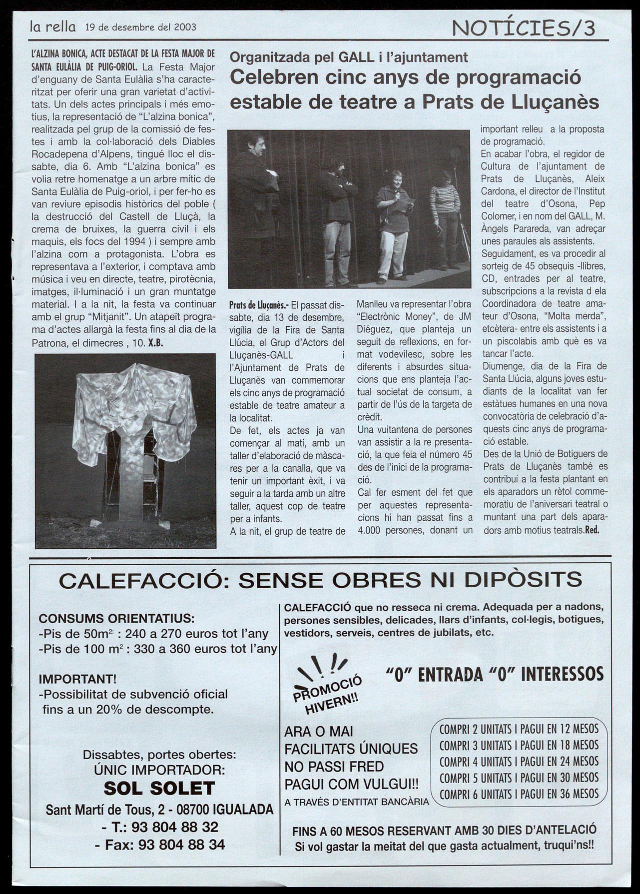 Prats de Lluçonès.- El passat dissabte, dia 13 de desembre, vigília de la Fira de Santa Llúcia, el Grup d'Actors del Lluçanès-GALL i l'Ajuntament de Prats de Lluçanès van commemorar els cinc anys de programació estable de teatre amateur a la localitat.