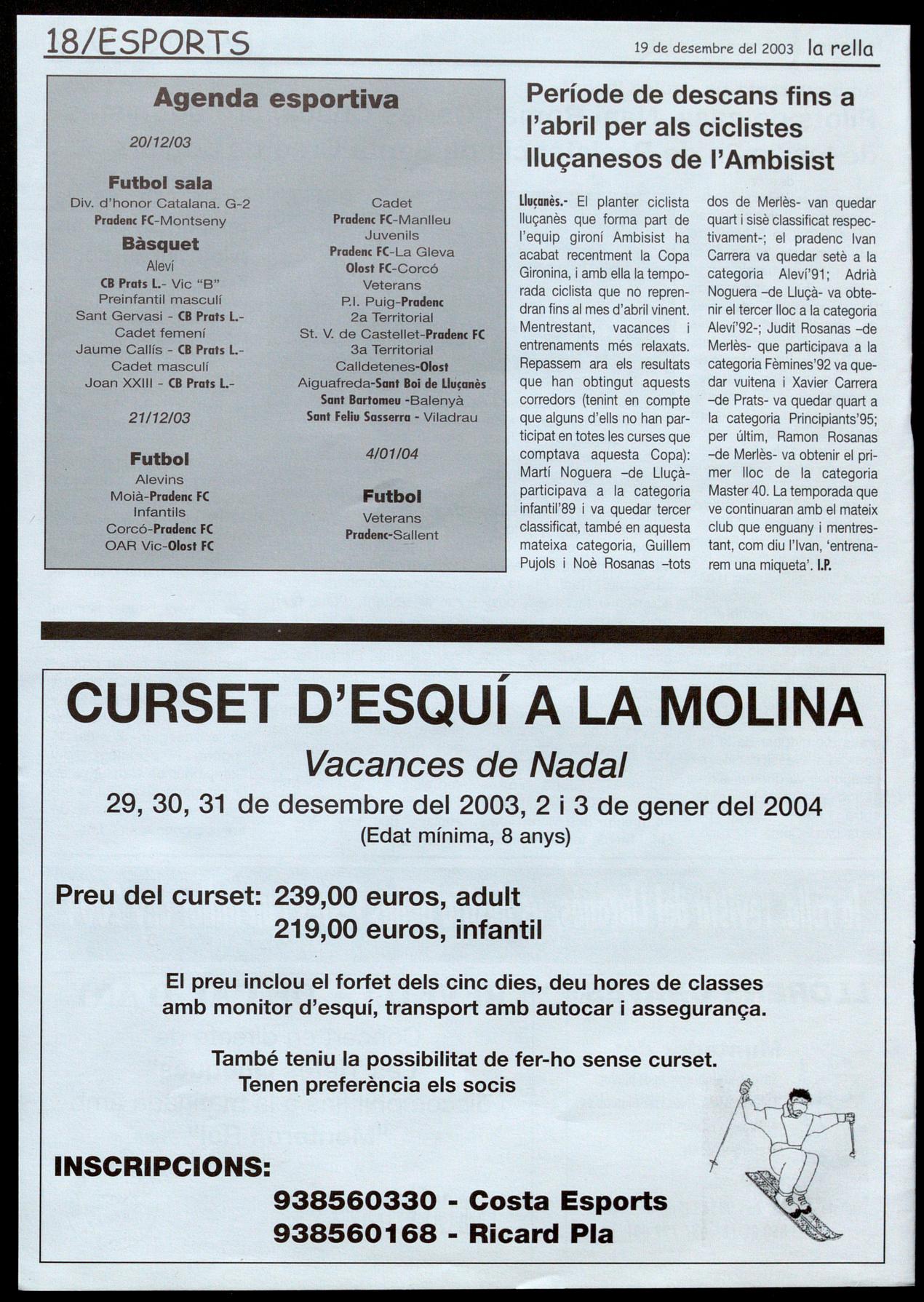 de Nadal 29, 30, 31 de desembre del 2003, 2 i 3 de gener del 2004 (Edat mínima, 8 anys) Preu del curset: 239,00 euros, adult 219,00 euros, infantil