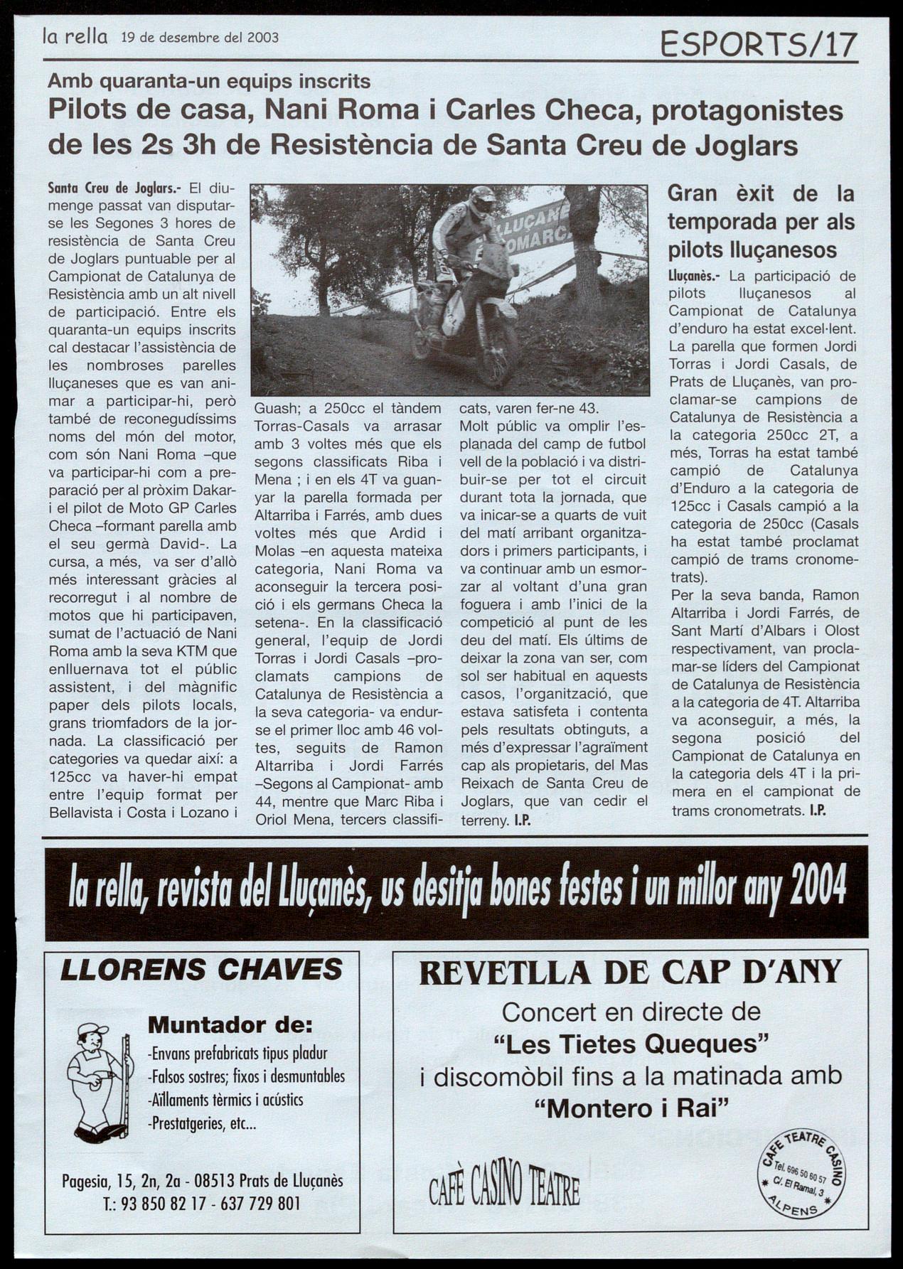 Santa Creu de Joglors.- El diumenge passat van disputarse les Segones 3 hores de resistència de Santa Creu de Joglars puntuable per al Campionat de Catalunya de Resistència amb un alt nivell de participació. Entre els quaranta-un equips inscrits cal destacar l'assistència de les nombroses parelles lluçaneses que es van animar a participar-hi, però també de reconegudíssims noms del món del motor, com són Nani Roma -que va participar-hi com a preparació per al pròxim Dakarel pilot de Moto GP Carles Checa -formant parella amb el seu germà David-. La cursa, a més, va ser d'allò més interessant gràcies al recorregut al nombre de motos que hi participaven, sumat de l'actuació de Nani Roma amb la seva KTM que enlluernava tot el públic assistent, i del màgnific paper dels pilots locals, grans triomfadors de la jornada. La classificació per categories va quedar així: a 125cc va haver-hi empat entre l'equip format per Bellavista i Costa i Lozano i