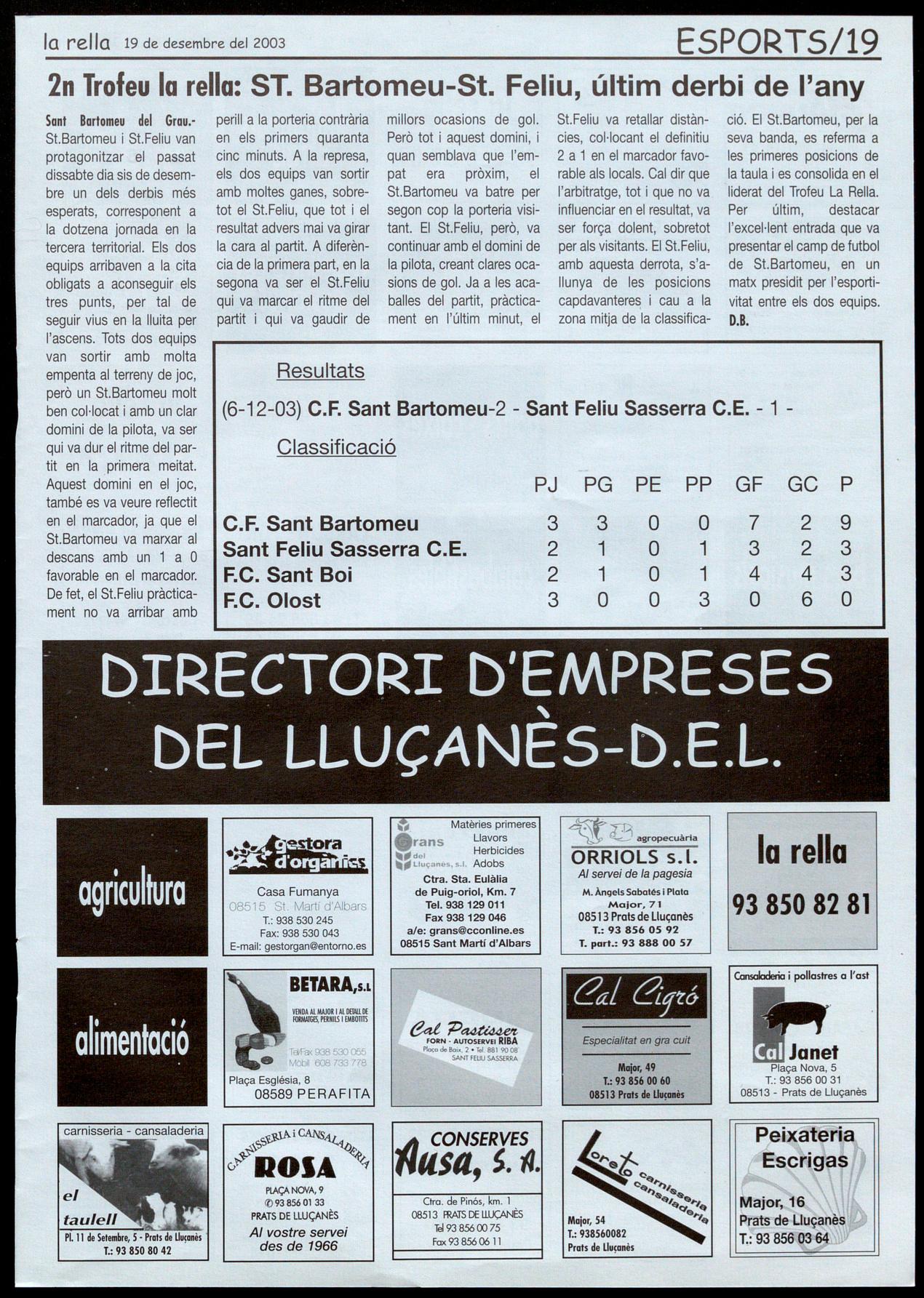 Sant Bartomeu del Grau.St.Bartomeu St.Feliu van protagonitzar el passat dissabte dia sis de desembre un dels derbis més esperats, corresponent a la dotzena jornada en la tercera territorial. Els dos equips arribaven a la cita obligats a aconseguir els tres punts, per tal de seguir vius en la lluita per l'ascens. Tots dos equips van sortir amb molta empenta al terreny de joc, però un St.Bartomeu molt ben col·locat amb un clar domini de la pilota, va ser qui va dur el ritme del partit en la primera meitat.