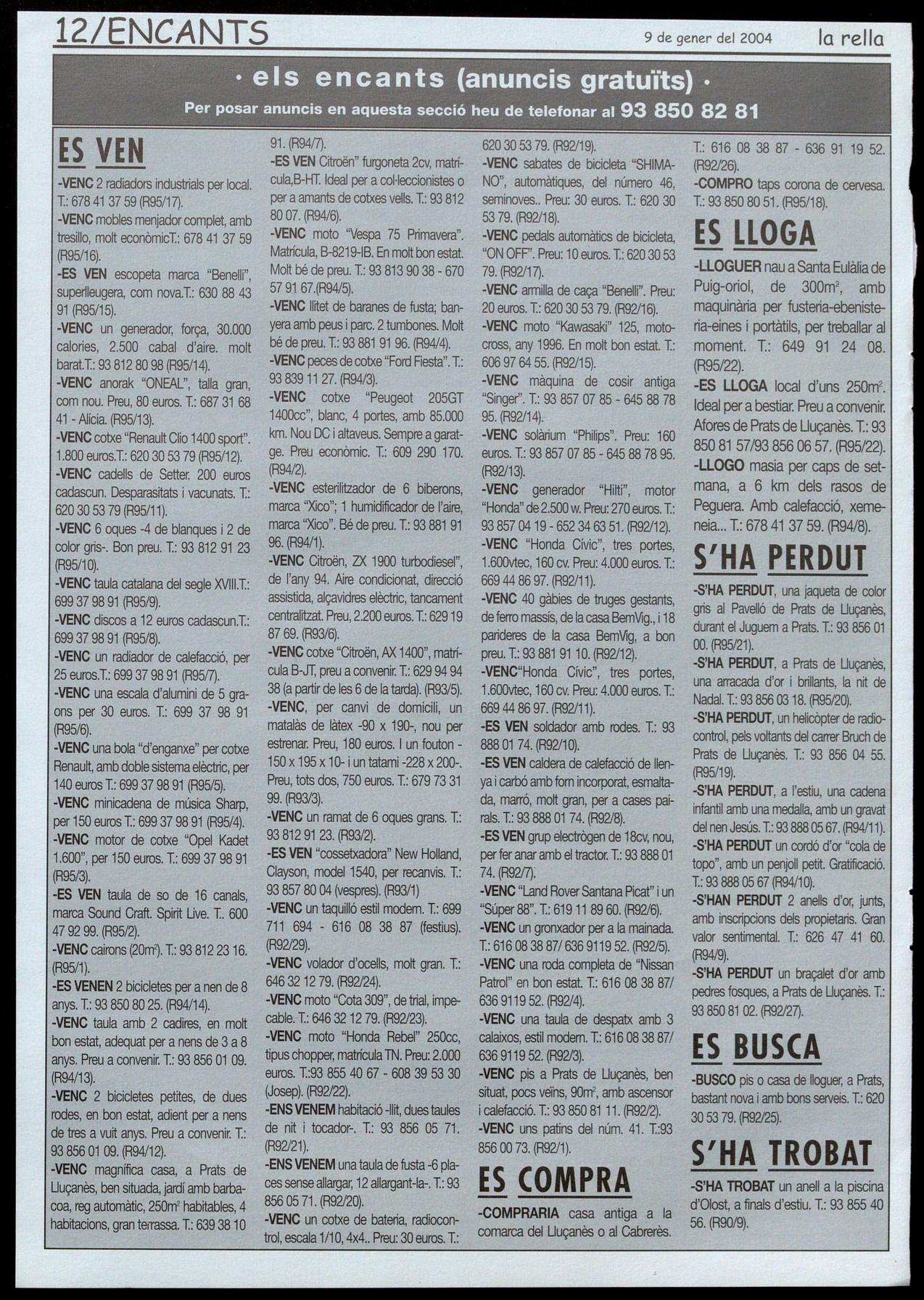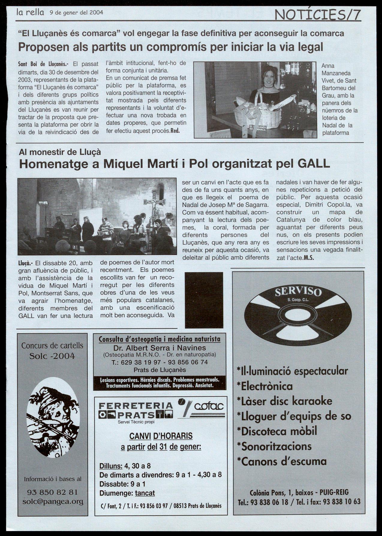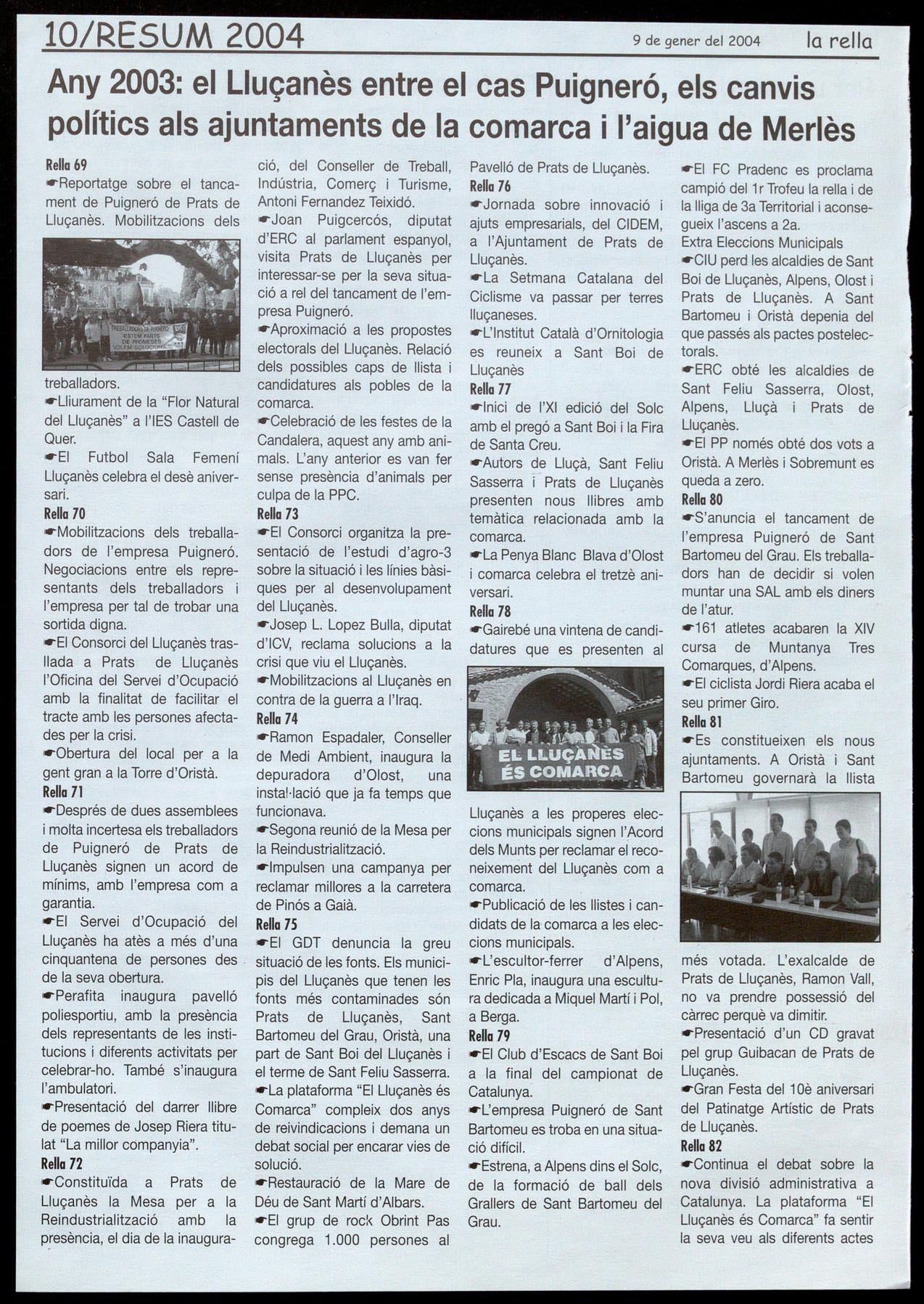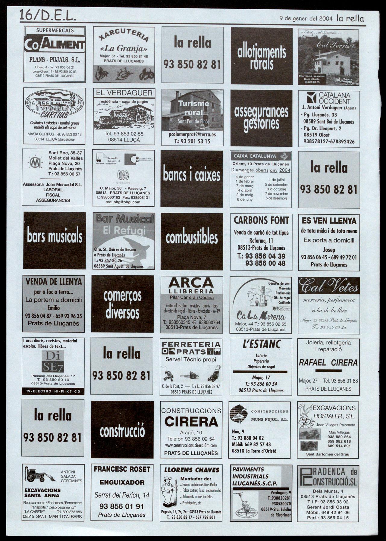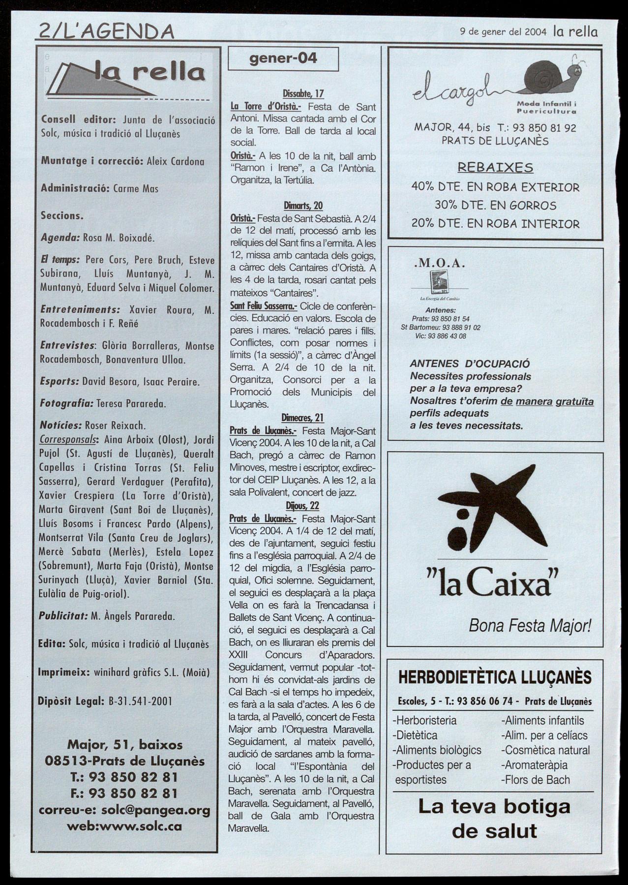 Calendari comarcal 2004. L'any que tot just acabem de començar ha portat com a novetat a tots els pobles de la comarca un calendari conjunt editat des del Consorci del Lluçanès, substituint d'aquesta manera altres iniciatives locals que es feien en algunes poblacions. Enguany el tema escollit ha estat el de les fonts, en la presentació hi ha un breu escrit dels Amics de les fonts del Lluçanès nord on exigeixen als organismes corresponents que rectifiquin en algunes de les seves actuacions per tal que les fonts tornin a ser fonts de vida llocs habituals de trobada com havien estat anteriorment. També el president del Consorci, Josep M.Freixanet, destaca les fonts com una herència que cal preservar. En aquesta edició, cada mes està il.lustrat amb fotografies de fonts dels diferents municipis amb una breu explicació de la seva situació característiques. R.R.