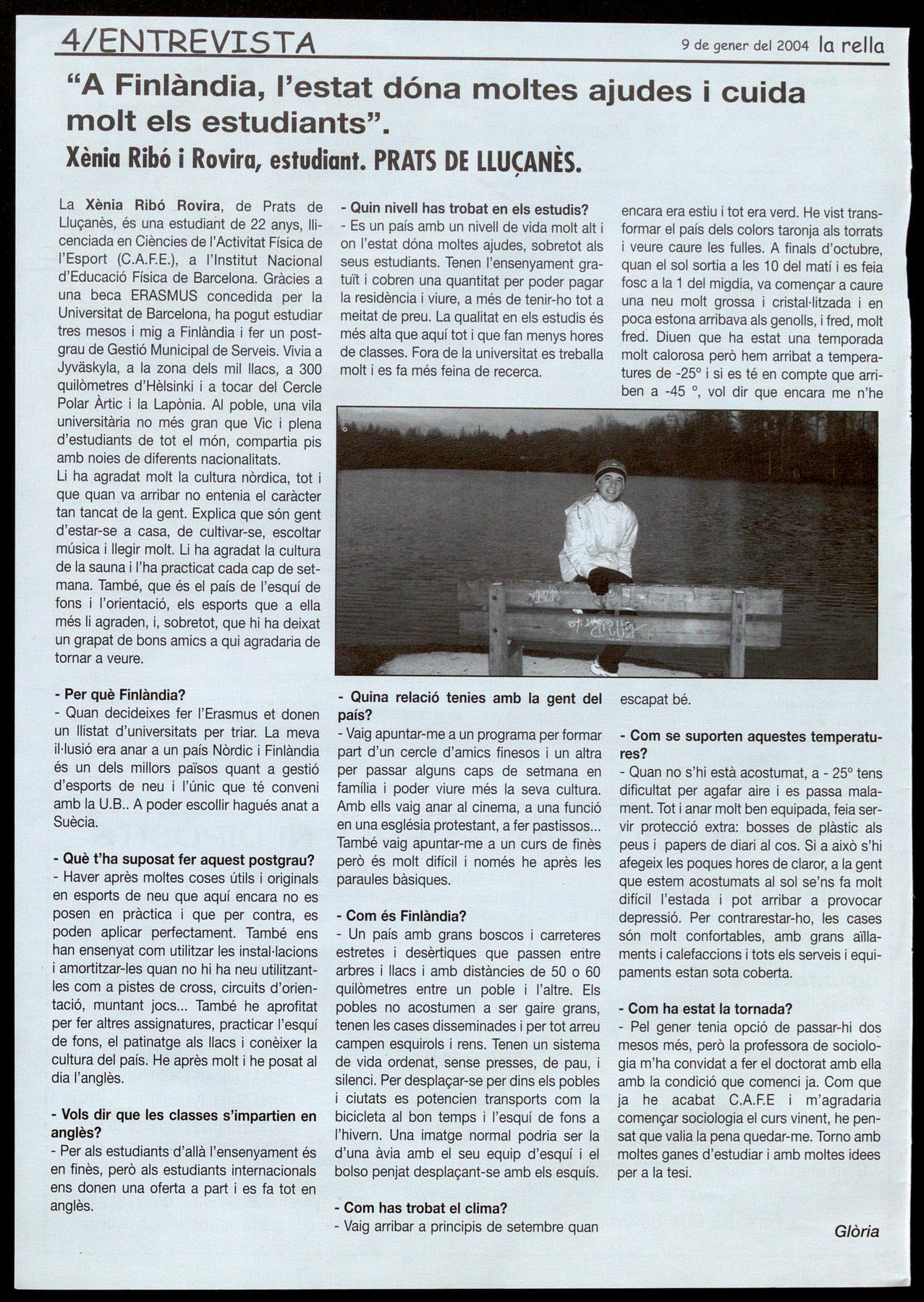 La Xènia Ribó Rovira, de Prats de Lluçanès, és una estudiant de 22 anys, llicenciada en Ciències de l'Activitat Física de l'Esport (CAF.E.), a l'Institut Nacional d'Educació Física de Barcelona. Gràcies a una beca ERASMUS concedida per la Universitat de Barcelona, ha pogut estudiar tres mesos i mig a Finlàndia i fer un postgrau de Gestió Municipal de Serveis. Vivia a Jyvâskyla, a la zona dels mil llacs, a 300 quilòmetres d'Hèlsinki a tocar del Cercle Polar Àrtic la Lapònia. AI poble, una vila universitària no més gran que Vic plena d'estudiants de tot el món, compartia pis amb noies de diferents nacionalitats. Li ha agradat molt la cultura nòrdica, tot que quan. va arribar no entenia el caràcter tan tancat de la gent. Explica que són gent d'estar-se a casa, de cultivar-se, escoltar música llegir molt. Li ha agradat la cultura de la sauna l'ha practicat cada cap de setmana. També, que és el país de l'esquí de fons l'orientació, els esports que a ella més li agraden, i, sobretot, que hi ha deixat un grapat de bons amics a qui agradaria de tornar a veure.