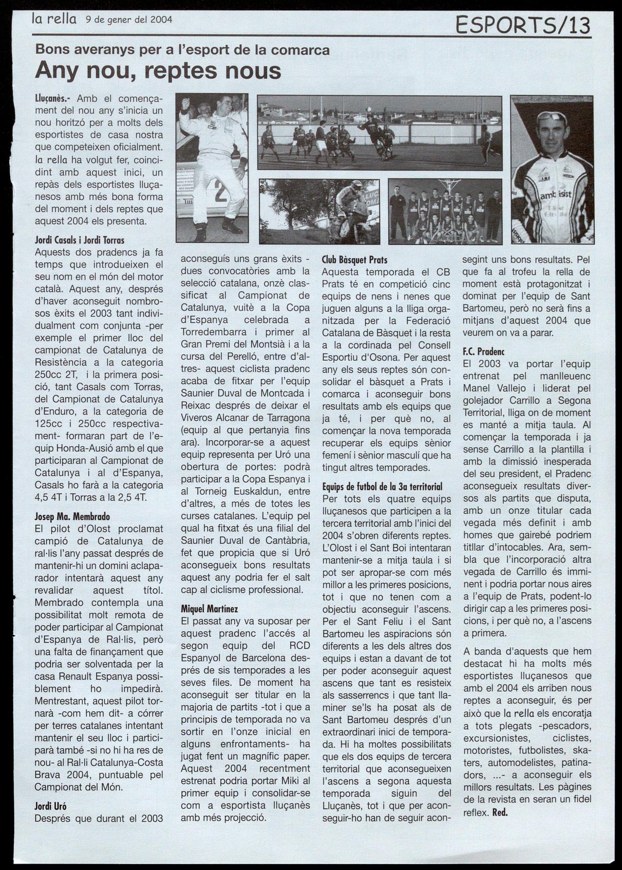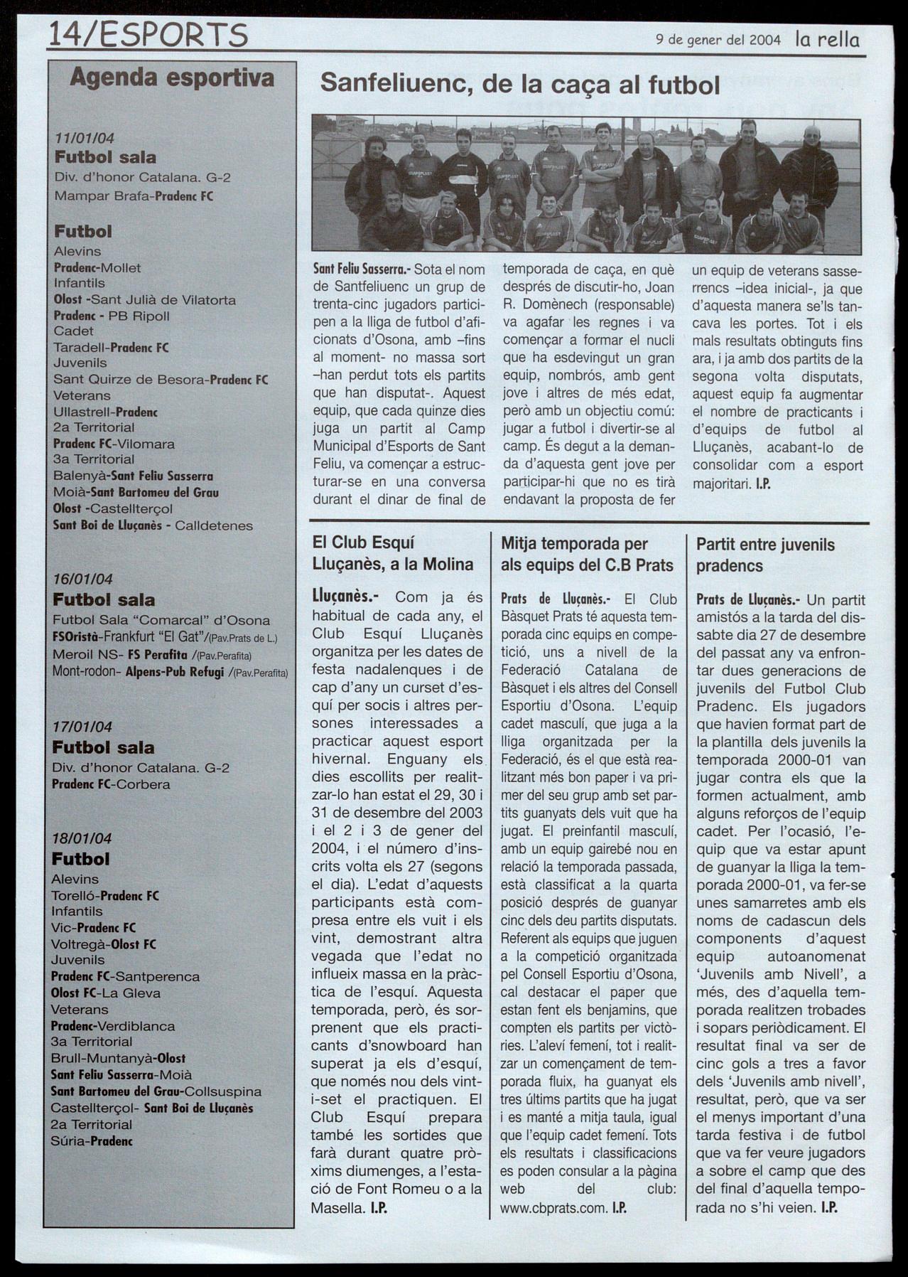 Lluçanès, a la Molina Lluçanès.- Com ja és habitual de cada any, el Club Esquí Lluçanès organitza per les dates de festa nadalenques de cap d'any un curset d'esquí per socis i altres persones interessades a practicar aquest esport hivernal. Enguany els. dies escollits per realitzar-lo han estat el 29, 30 i 31 de desembre del 2003 el 2 3 de gener del 2004, i el número d'inscrits volta els 27 (segons el dia). L'edat d'aquests participants està compresa entre els vuit els vint, demostrant altra vegada que l'edat no influeix massa en la pràctica de l'esquí. Aquesta temporada, però, és sorprenent que els practicants d'snowboard han superat ja els d'esquí, que només nou dels vinti-set el practiquen. El Club Esquí prepara també les sortides que farà durant quatre pròxims diumenges, a l'estació de Font Romeu o a la Masella. I.P.