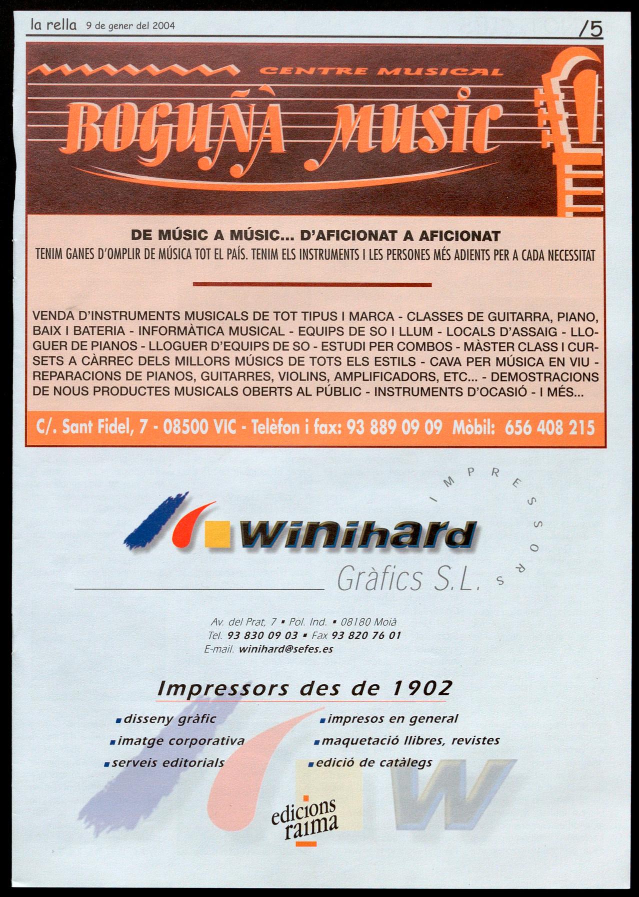 Prots de Uuamès.- Festa Major-Sant Vicenç 2004. A les 10 de la nit, a Cal Bach, pregó a càrrec de Ramon Minoves, mestre i escriptor; exdirector del CEIP Uuçanès. A les 12, a la sala Polivalent, concert de jazz.