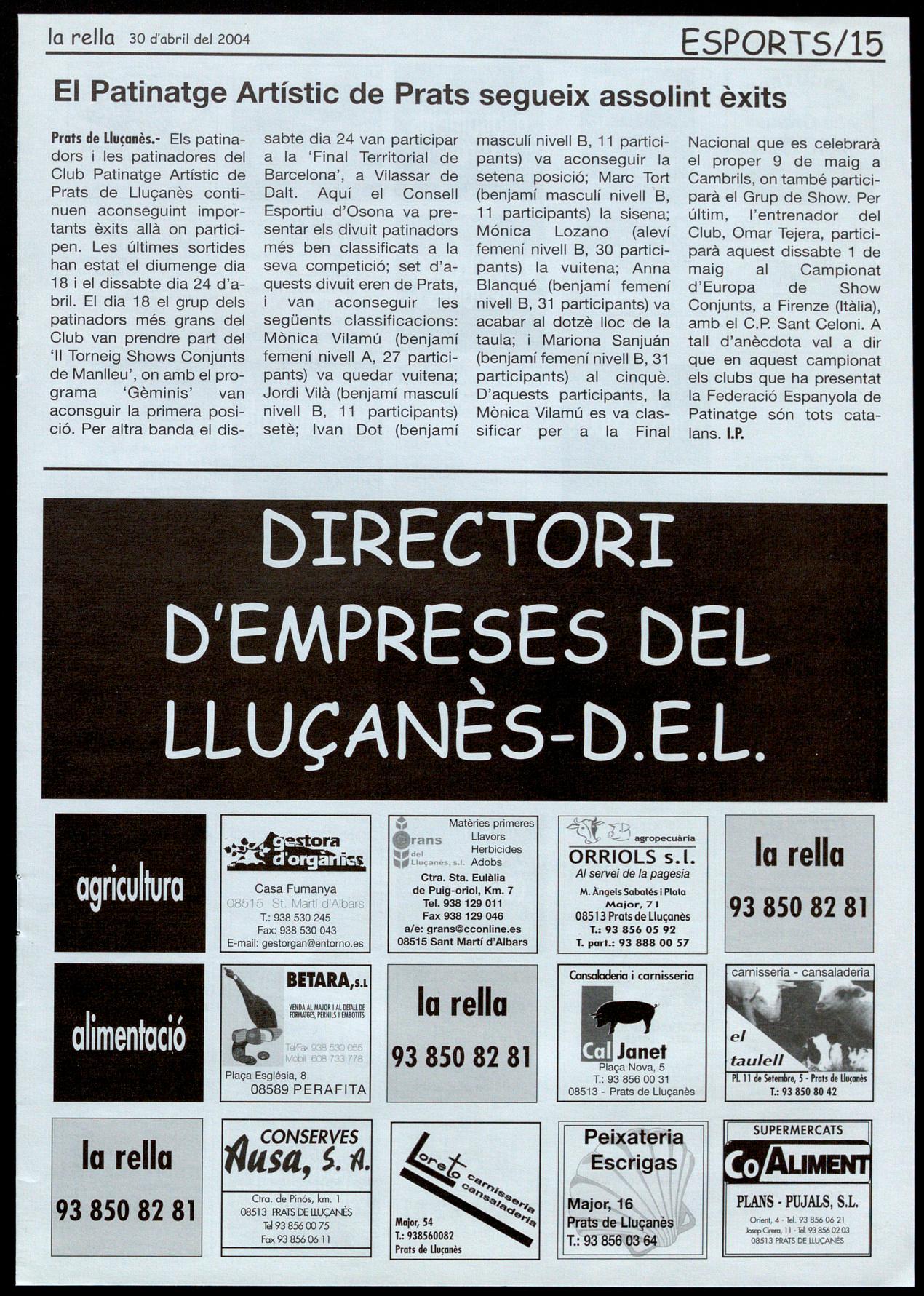Prats de Lluçanès.- Els patinadors les patinadores del Club Patinatge Artístic de Prats de Lluçanès contínuen aconseguint impertants èxits allà on participen. Les últimes sortides han estat el diumenge dia 18 el dissabte dia 24 d'abril. El dia 18 el grup dels patinadors més grans del Club van prendre part del 'II Torneig Shows Conjunts de Manlleu', on amb el programa 'Gèminis' van aconsguir la primera posició. Per altra banda el dis-