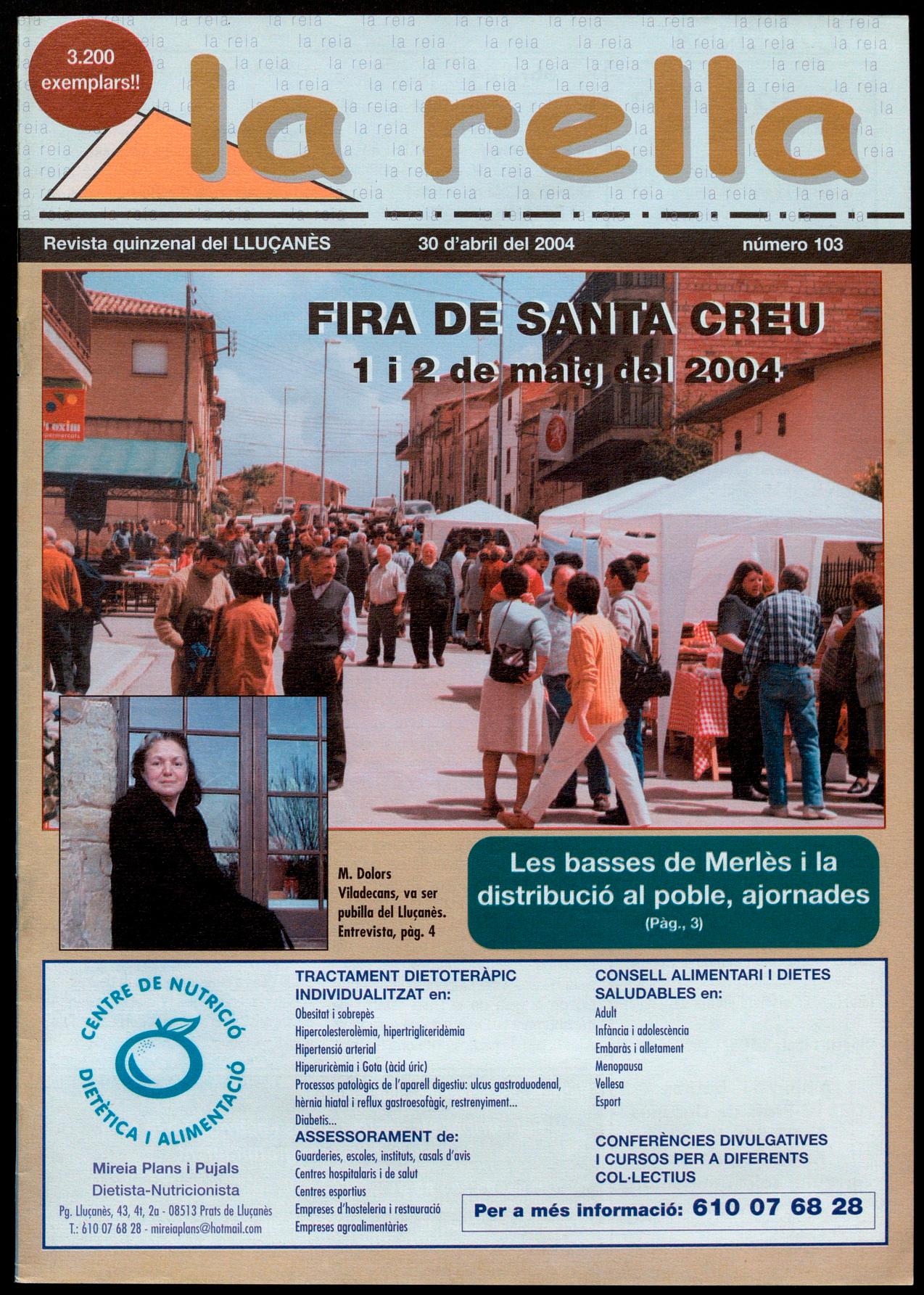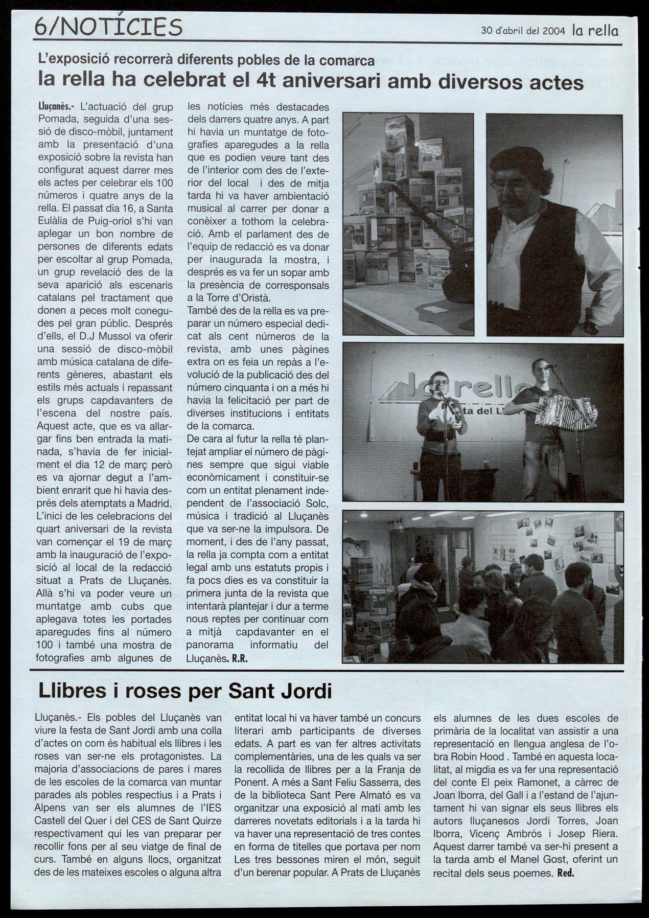 Llu�onès.- L'actuació del grup Pomada, seguida d'una sessió de disco-mòbil, juntament amb la presentació d'una exposició sobre la revista han configurat aquest darrer mes els actes per celebrar els 100 números quatre anys de la rella. El passat dia 16, a Santa Eulàlia de Puig-oriol s'hi van aplegar un bon nombre de persones de diferents edats per escoltar al grup Pomada, un grup revelació des de la seva aparició als escenaris catalans pel tractament que donen a peces molt conegudes pel gran públic. Després d'ells, el D.J Mussol va oferir una sessió de disco-mòbil amb música catalana de diferents gèneres, abastant els estils més actuals i repassant els grups capdavanters de l'escena del nostre país. Aquest acte, que es va allargar fins ben entrada la matinada, s'havia de fer inicialment el dia 12 de març però es va ajornar degut a l'ambient enrarit que hi havia després dels atemptats a Madrid. L'inici de les celebracions del quart aniversari de la revista van començar el 19 de març amb la inauguracióde l'exposició al local de la redacció situat a Prats de Lluçanès. Allà s'hi va poder veure un muntatge amb cubs que aplegava totes les portades aparegudes fins al número 100 també una mostra de fotografies amb algunes de