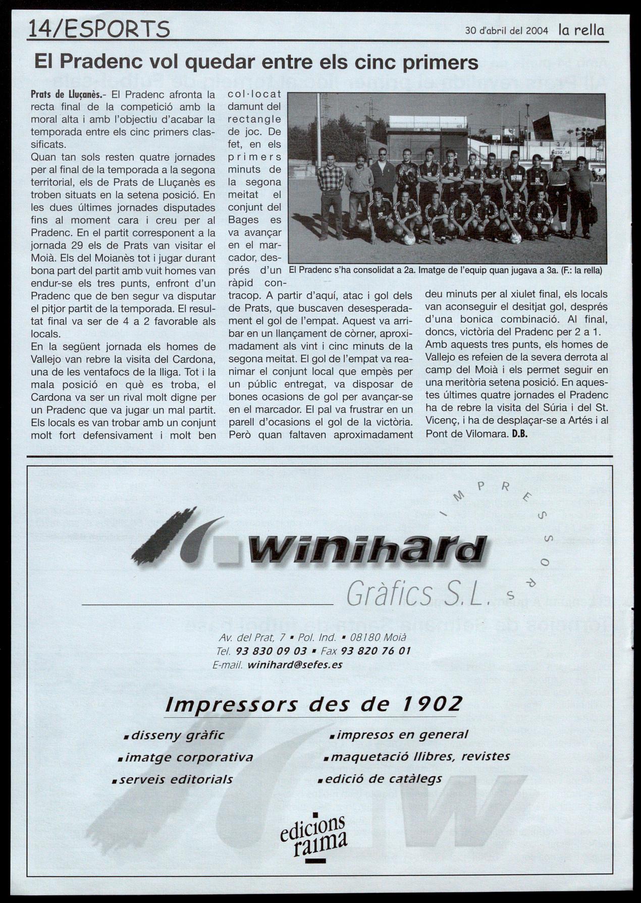 ràpid contracop. A partir d'aquí, atac gol dels de Prats, que buscaven desesperadament el gol de l'empat. Aquest va arribar en un llançament de còrner, aproximadament als vint cinc minuts de la segona meitat. El gol de l'empat va reanimar el conjunt local que empès per un públic entregat, va disposar de bones ocasions de gol per avançar-se en el marcador. El pal va frustrar en un parell d'ocasions el gol de la victòria. Vicenç, i ha de desplaçar-se a Artés i al Però quan faltaven aproximadament Pont de Vilomara. D.B.