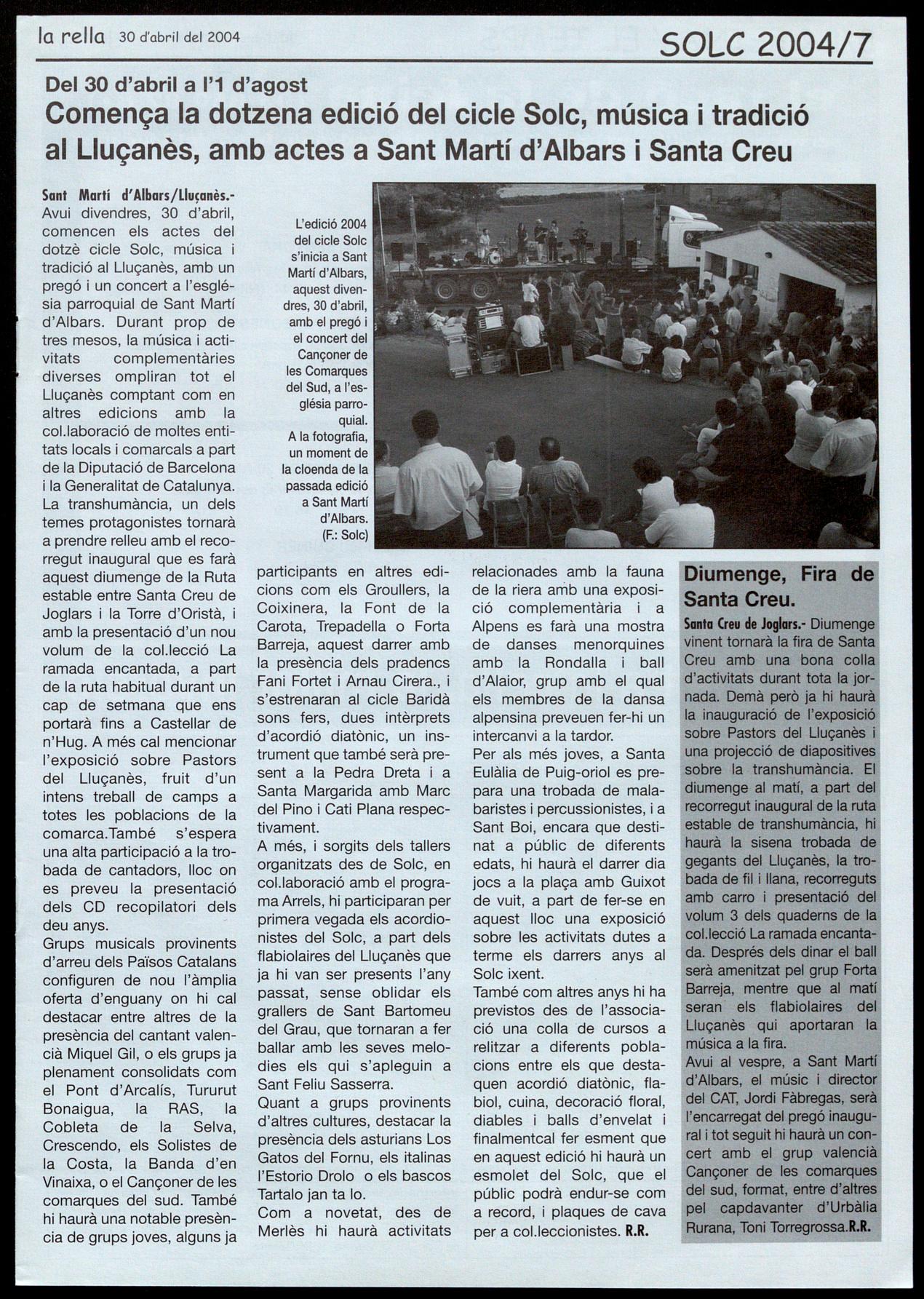 ScIlla (reu de Jocps.- Solc-2004. A 2/4 de 10 del vespre, a les antigues escoles, inauguració de l'exposició "Pastors del Uuçanès", recollida, coordinada i muntada per Montse Rocadembosch. Joan Rovira, del Penedès, farà una projecció comentada sobre la transhumància.