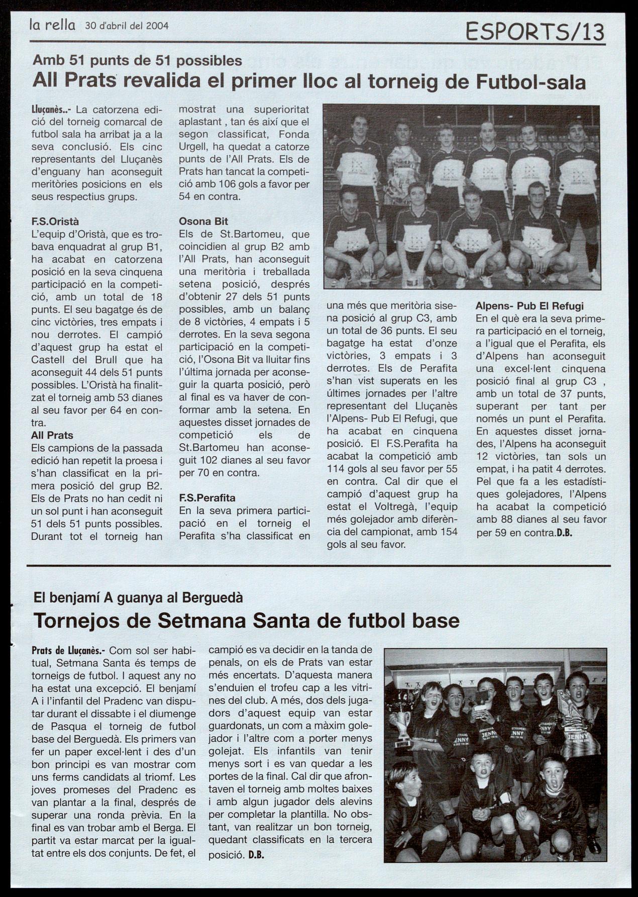 Prots de Llu�anès.- Com sol ser habitual, Setmana Santa és temps de torneigs de futbol. I aquest any no ha estat una excepció. El benjamí A l'infantil del Pradenc van disputar durant el dissabte el diumenge de Pasqua el torneig de futbol - base del Berguedà. Els primers van fer un paper excel-lent i des d'un bon principi es van mostrar com uns ferms candidats al triomf. Les joves promeses del Pradenc es van plantar a la final, després de superar una ronda prèvia. En la final es van trobar amb el Berga. El partit va estar marcat per la igualtat entre els dos conjunts. De fet, el