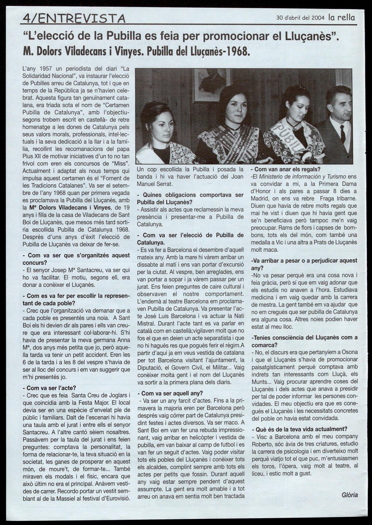 - Es va fer a Barcelona el desembre d'aquell mateix any. Amb la mare hi vàrem arribar un dissabte al matí ens van portar d'excursió per la ciutat. AI vespre, ben arreglades, ens van portar a sopar ja vàrem passar per un jurat. Ens feien preguntes de caire cultural observaven el nostre comportament. L'endemà al teatre Barcelona em proclamaven Pubilla de Catalunya. Va presentar l'acte José Luis Barcelona va actuar la Nati Mistral. Durant l'acte tant es va parlar en català com en castellà;vigilaven molt que no fos el que en deien un acte separatista que no hi hagués res que pogués ferir el règim.A partir d'aquí ja em veus vestida de catalana per tot Barcelona visitant l'ajuntament, la Diputació, el Govern Civil, el Militar Vaig conèixer molta gent el nom del Lluçanès va sortir a la primera plana dels diaris.