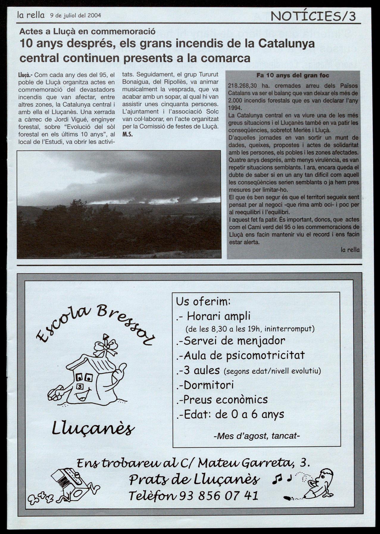 Llu�à.- Com cada any des del 95, el tats. Seguidament, el grup Tururut poble de Lluçà organitza actes en Bonaigua, del Ripollès, va animar commernoració del devastadors musicalment la vesprada, que va incendis que van afectar, entre acabar amb un sopar, al qual hi van altres zones, la Catalunya central assistir unes cinquanta persones. amb ella el' Lluçanès. Una xerrada L'ajuntament l'associació Solc a càrrec de Jordi Vigué, enginyer van col·laborar, en l'acte organitzat forestal, sobre "Evolució del sòl per la Comissió de festes de Lluçà. forestal en els últims 10 anys", al M.S. local de l'Estudi, va obrir les activi-