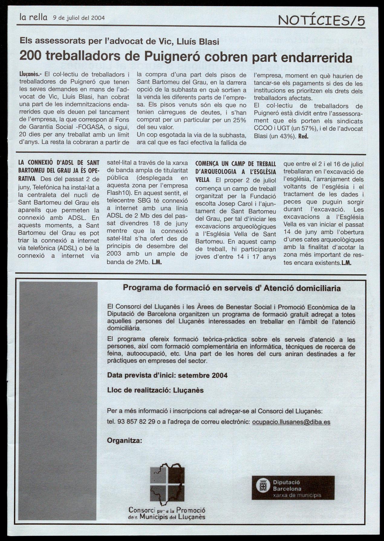 BARTOMEU DEL GRAU JA ÉS OPERATlVA, Des del passat 2 de juny, Telefónica ha instal·lat a la centraleta del nucli de Sant Bartomeu del Grau els aparells que permeten la connexió amb ADSL. En aquests moments, a Sant Bartomeu del Grau es pot triar la connexió a internet via telefònica (ADSL) o bé la connexió a internet via