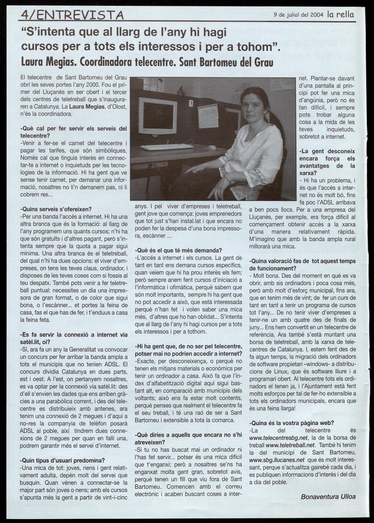 -Sí, ara fa un any la Generalitat va oonvocar un concurs per fer arribar la banda ampla a tots el municipis que no tenien ADSL. El concurs dividia Catalunya en dues parts, est oest. A l'est, on pertanyem nosaltres, es va optar per la connexió via satèl.lit: des d'ell s'envien les dades que ens arriben gràcies a una parabòlica corrent, i des del telecentre es distribuieix amb antenes, ara tenim una connexió de 2 megues d'aquí a no-res la companyia de telèfon posarà ADSL al poble, així tindrem dues connexions de 2 megues per quan en falli una, podrem garantir més el servei d'internet.