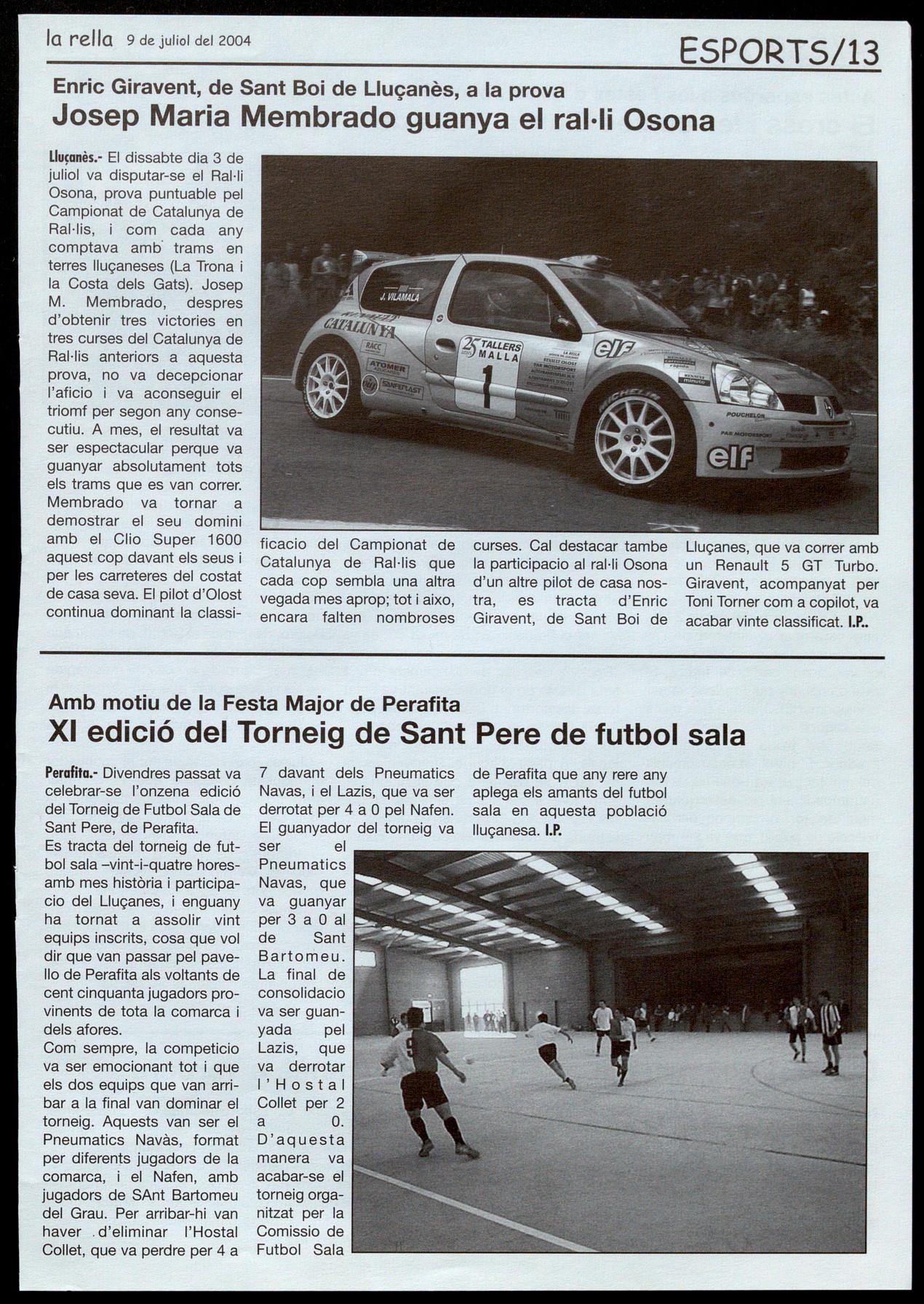 Lluçanès.- El dissabte dia 3 de juliol va disputar-se el Ral·li Osona, prova puntuable pel Campionat de Catalunya de Ral·lis, com cada any comptava amb" trams en terres lluçaneses (La Trona i la Costa dels Gats). Josep M. Membrado, despres d'obtenir tres victories en tres curses del Catalunya de Hal-lis anteriors a aquesta prava, no va decepcionar I'aficio i va aconseguir el triomf per segon any consecutiu. A mes, el resultat va ser espectacular perque va guanyar absolutament tots els trams que es van carrer. Membrado va tornar a demostrar el seu domini amb el Clio Super 1600 aquest cop davant els seus per les carreteres del costat de casa seva. El pilot d'Olost continua dominant la classi-