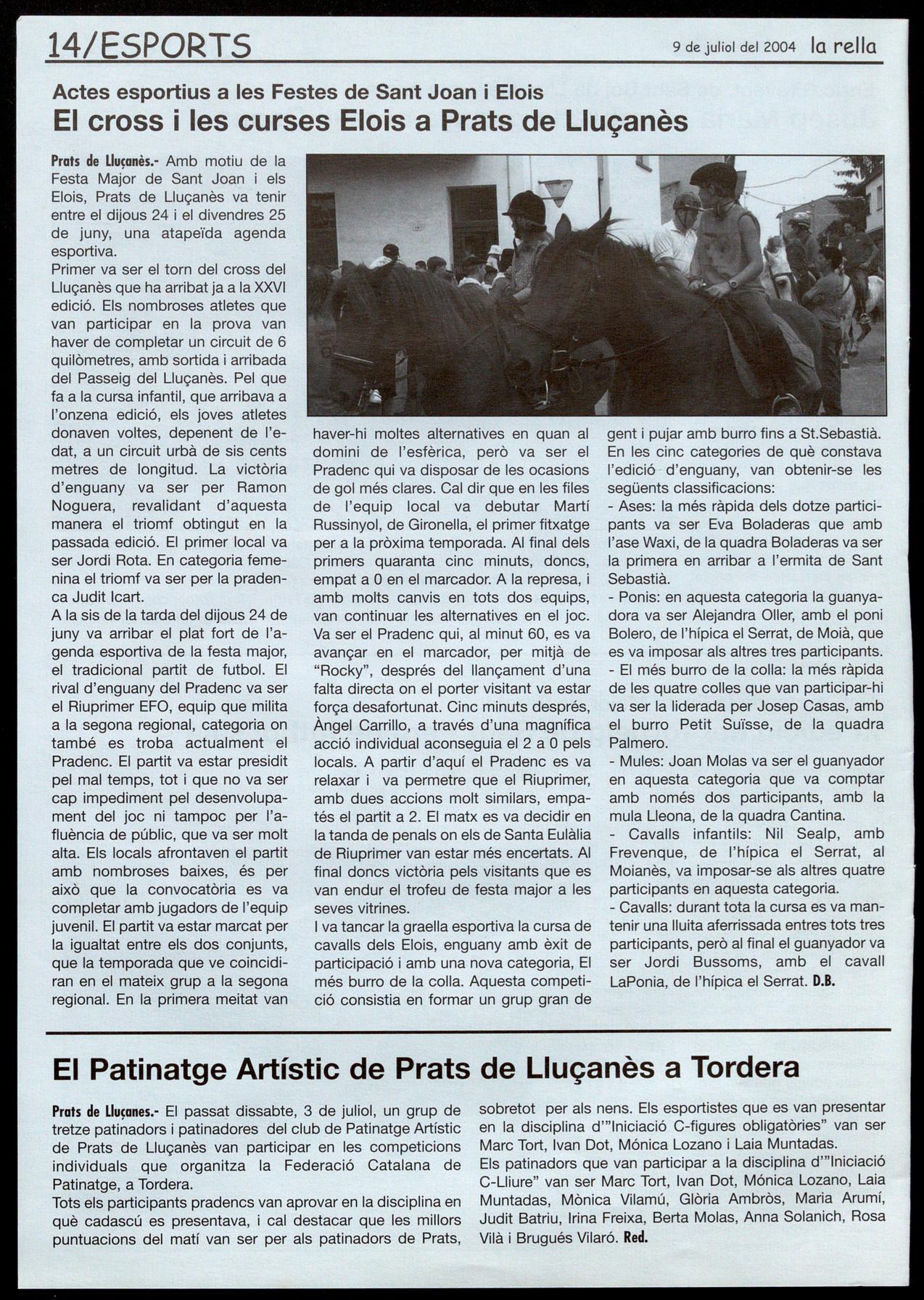 - Cavalls: durant tota la cursa es va mantenir una lluita aferrissada entres tots tres participants, però al final el guanyador va ser Jordi Bussoms, amb el cavall LaPonia, de t'hípica el Serrat. D.B.