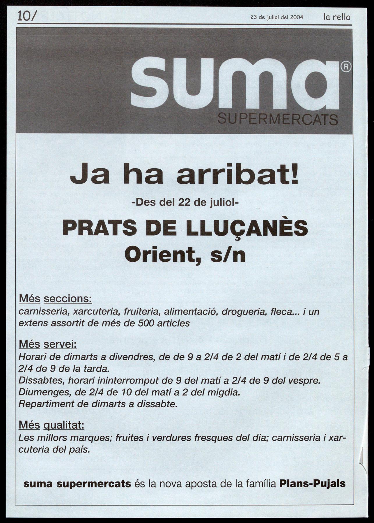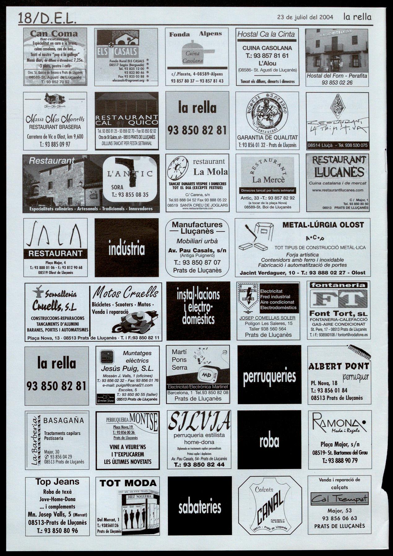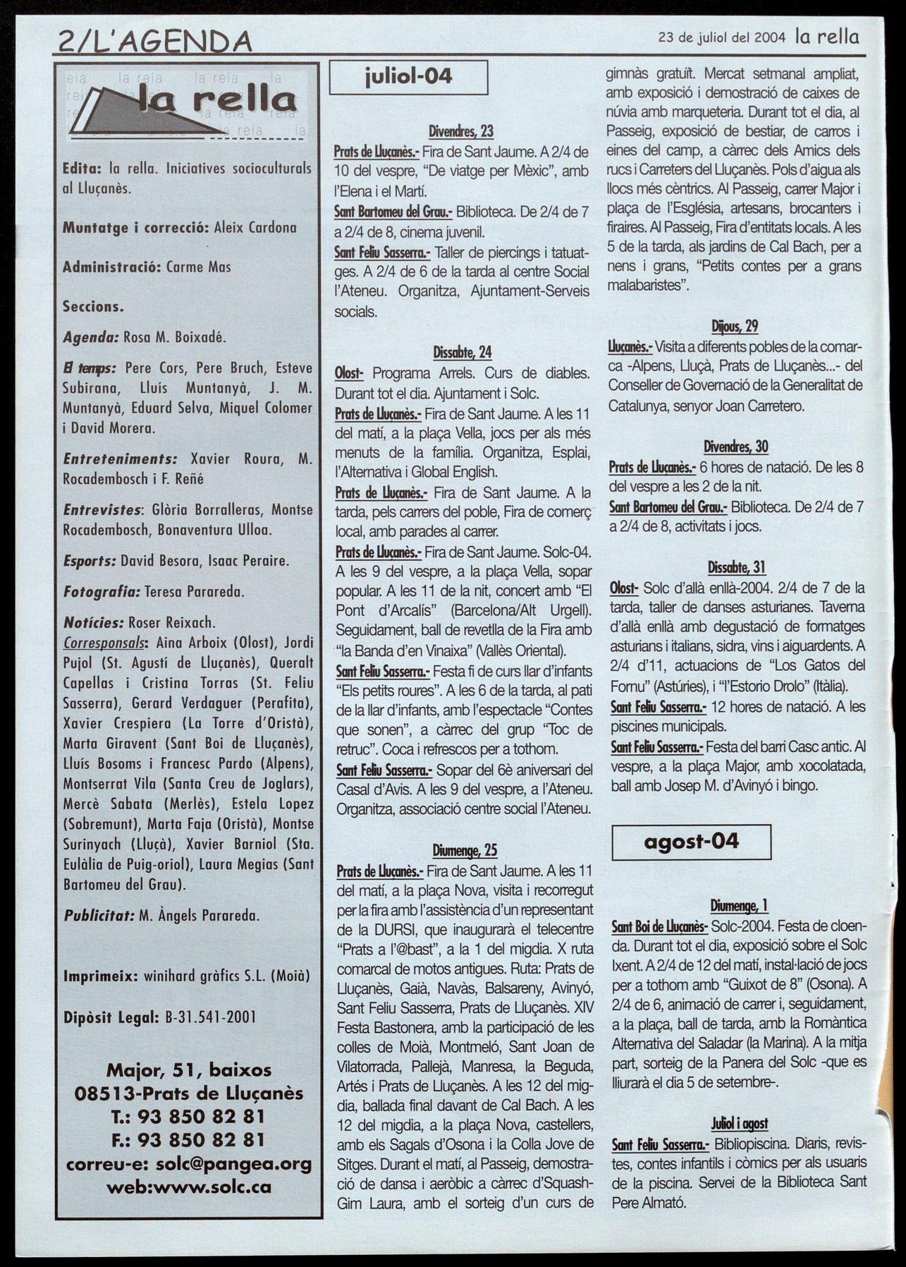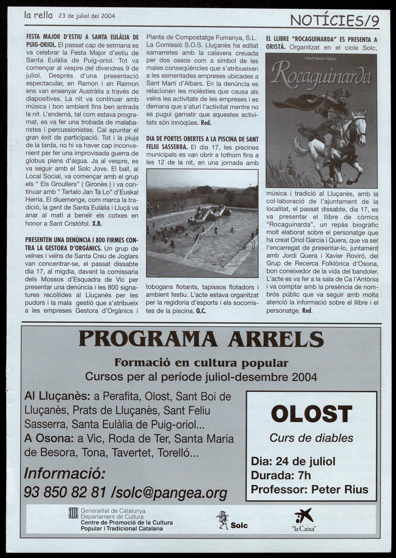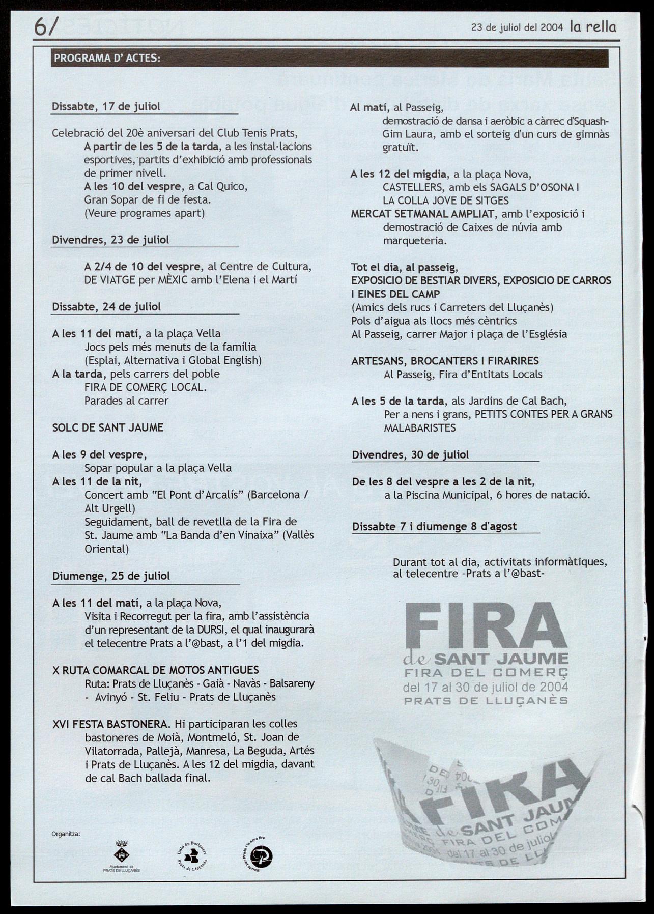Pratsde Uuamès.- Fira de Sant Jaume. Solc-04. A les 9 del vespre, a la plaça Vella, sopar popular. A les 11 de la nit, concert amb "El Pont d'Arcalís" (Barcelona/Alt Urgell). Seguidament, ball de revetlla de la Fira amb "la Banda d'en Vinaixa" (Vallès OrientaQ. Sœrt Feliu Sasserra.- Festa fi de curs llar d'infants "Els petits roures". A les 6 de la tarda, al pati de la llar d'infants, amb l'espectacle "Contes que sonen", a càrrec del grup ''Toc de retruc". Coca refrescos per a tothom.