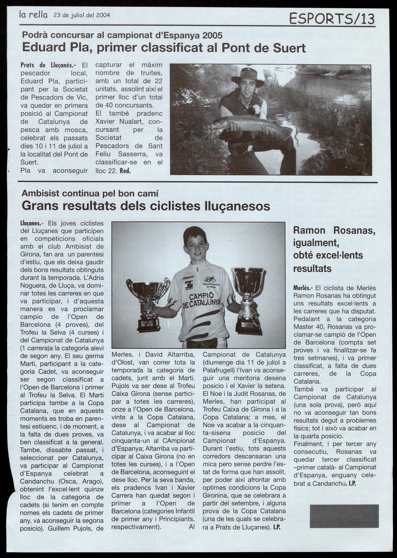 Prots de Llusanès.- El pescador local, Eduard Pla, participant per la Societat de Pescadors de Vic, va quedar en primera posició al Campionat de Catalunya de pesca amb mosca, celebrat els passats dies 10 11 de juliol a la localitat. del Pont de Suert.