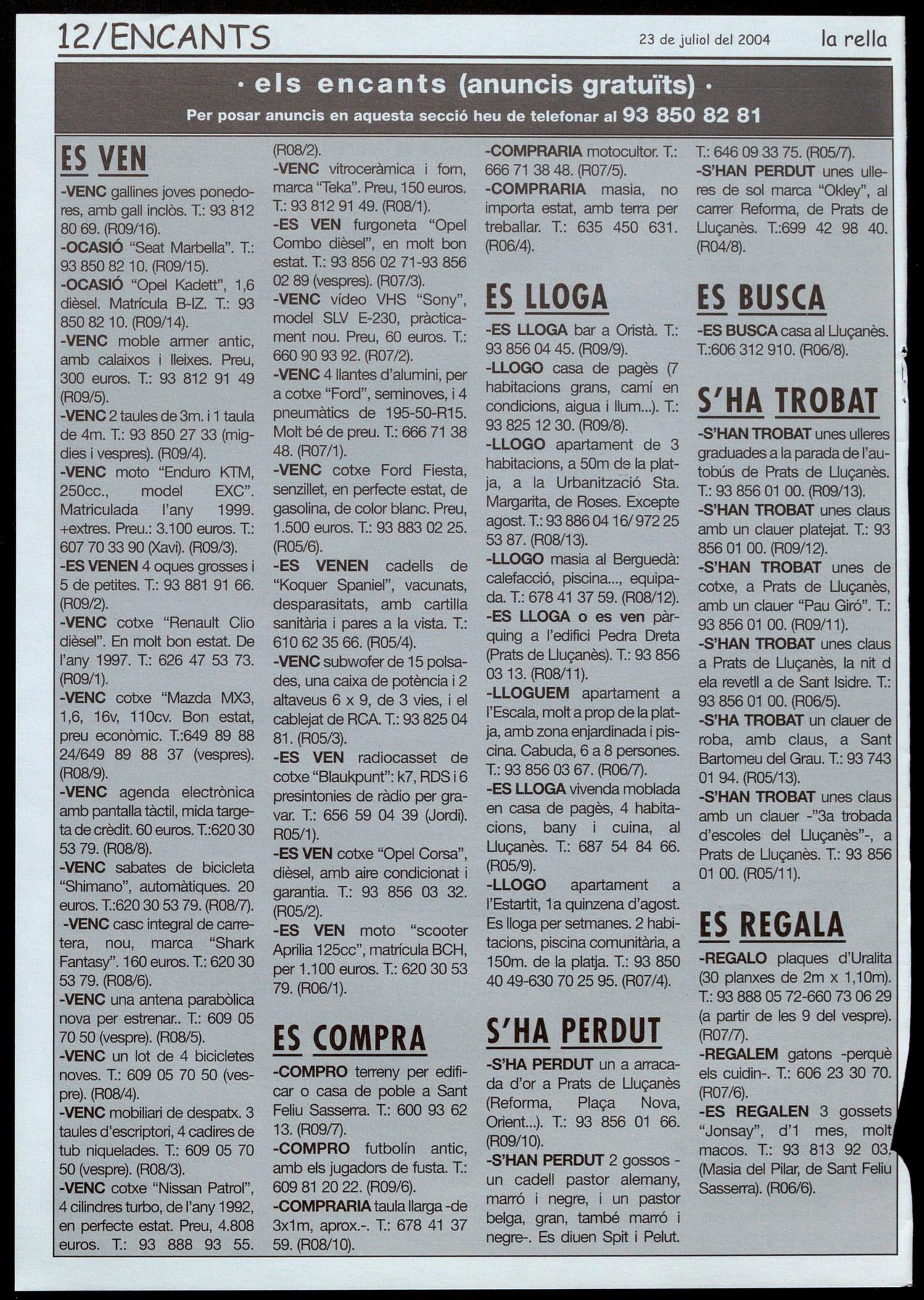 Per posar anuncis en aquesta secció heu de telefonar al 93 850 82 81