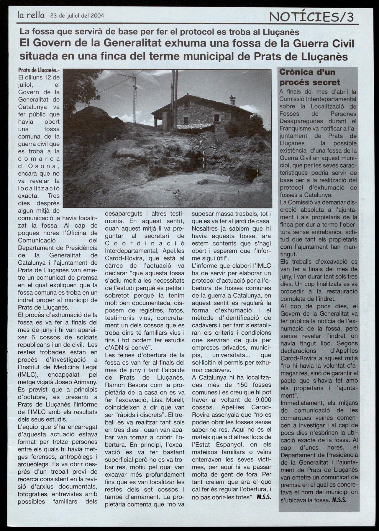 Mantinguda en secret inicialment la seva ubicació la fossa pilot per elaborar el protocol d'exhumació està situada a Prats de lluçanès i se n'han extret set cadàvers (Pàg.3)