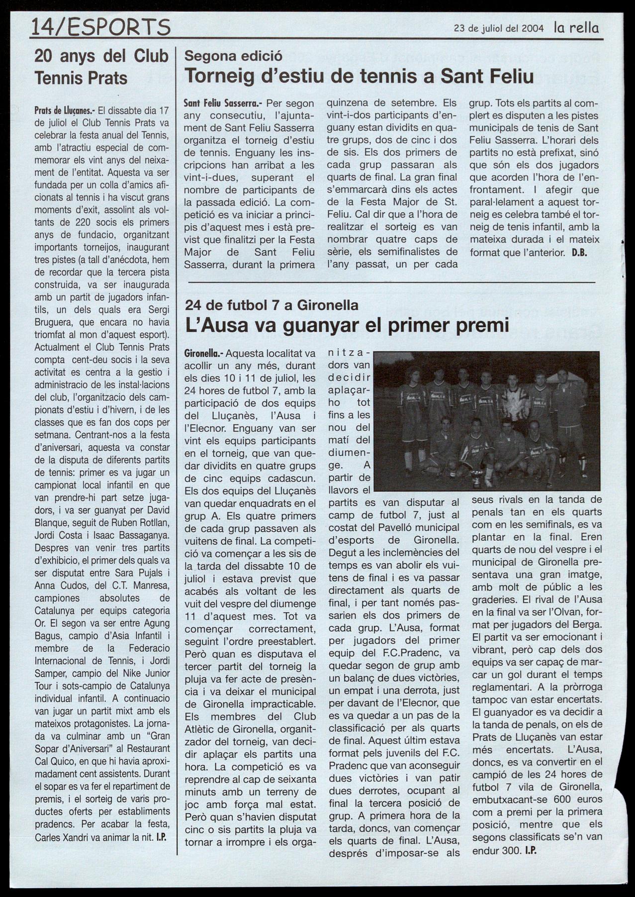 Prats de Lluçanes." El dissabte dia 17 de juliol el Club Tennis Prats va celebrar la festa anual del Tennis amb l'atractiu especial de com� memorar els vint anys del neixament de l'entitat. Aquesta va ser fundada per un colla d'amics aficionats al tennis ha viscut grans moments d'exit, assolint als voltants de 220 socis els primers anys de fundacio, organitzant importants torneijos, inaugurant tres pistes (a tall d'anécdota, hem de recordar que la tercera pista construida, va ser inaugurada amb un partit de jugadors infantils, un dels quals era Sergi Bruguera, que encara no havia triomfat al mon d'aquest esport).