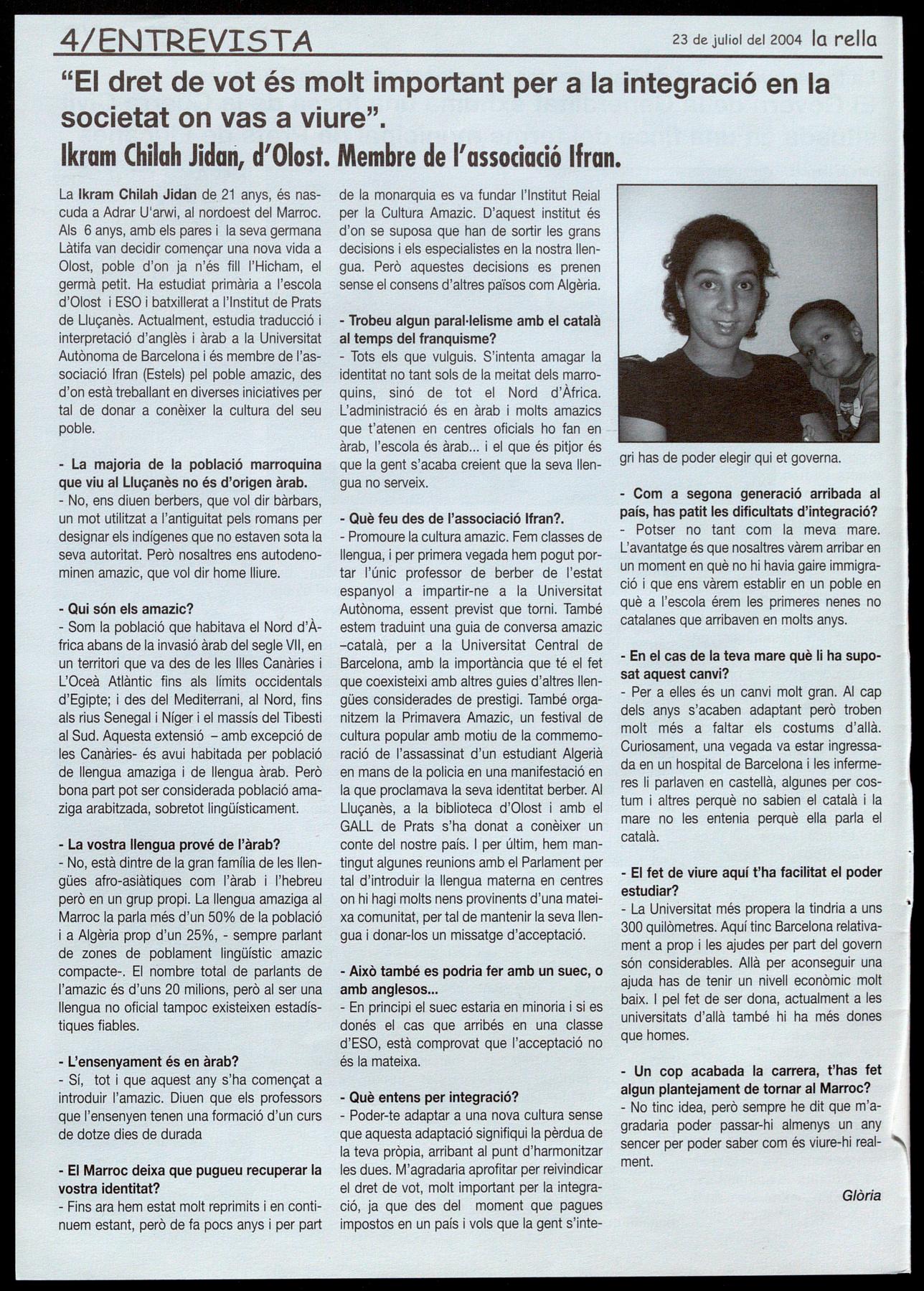 La Ikram Chilah Jidan de.21 anys, és nascuda a Adrar U'arwi, al nordoest del Marroc. Als 6 anys, amb els pares i la seva germana Làtifa van decidir començar una nova vida a Olost, poble d'on ja n'és fill I'Hicham, el germà petit Ha estudiat primària a l'escola d'Olost ESO i batxillerat a l'Institut de Prats de Lluçanès. Actualment, estudia traducció interpretació d'anglès àrab a la Universitat Autònoma de Barcelona i és membre de l'associació Ifran (Estels) pel poble amazic, des d'on està treballant en diverses iniciatives per tal de donar a conèixer la cultura del seu poble.